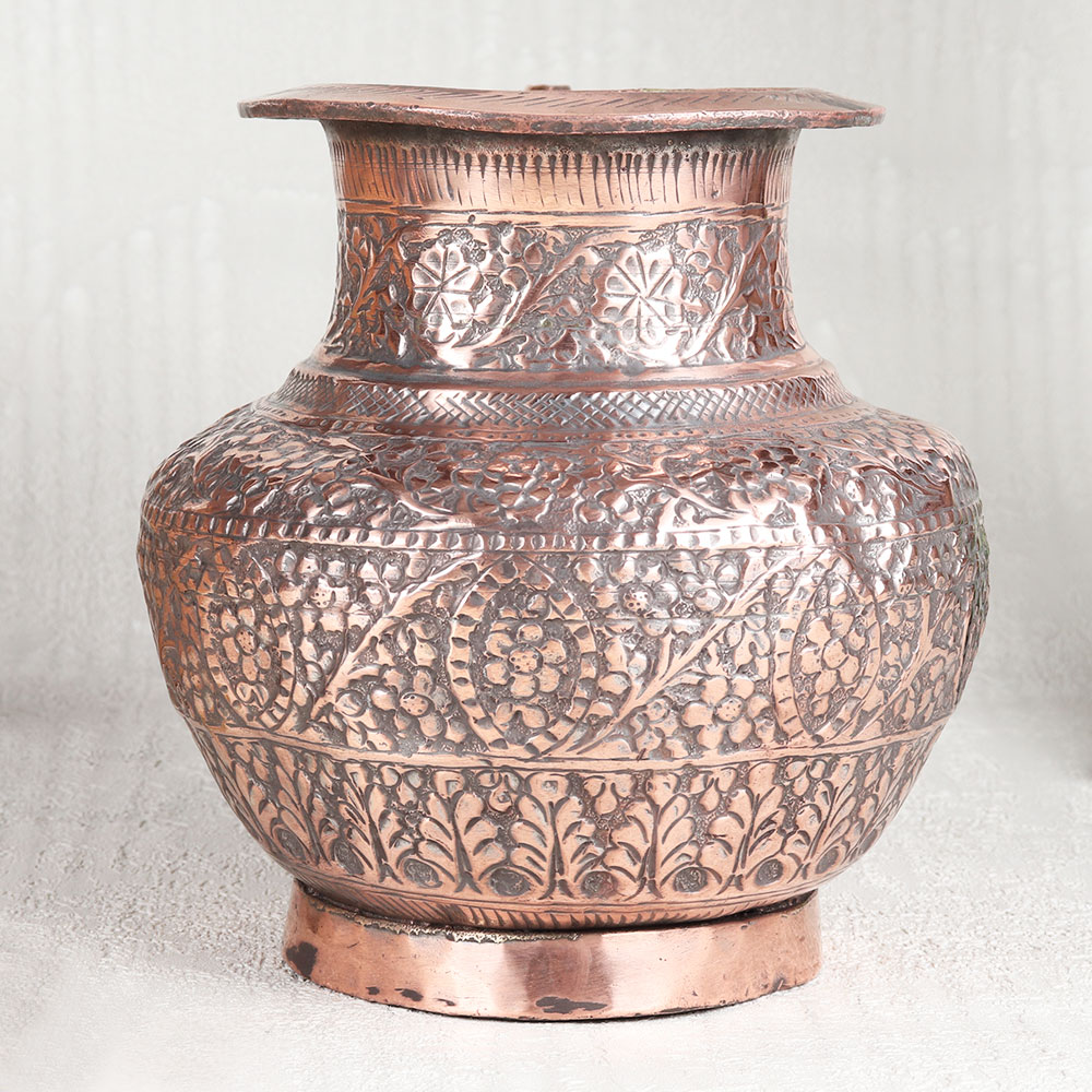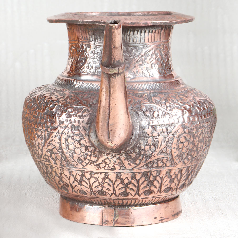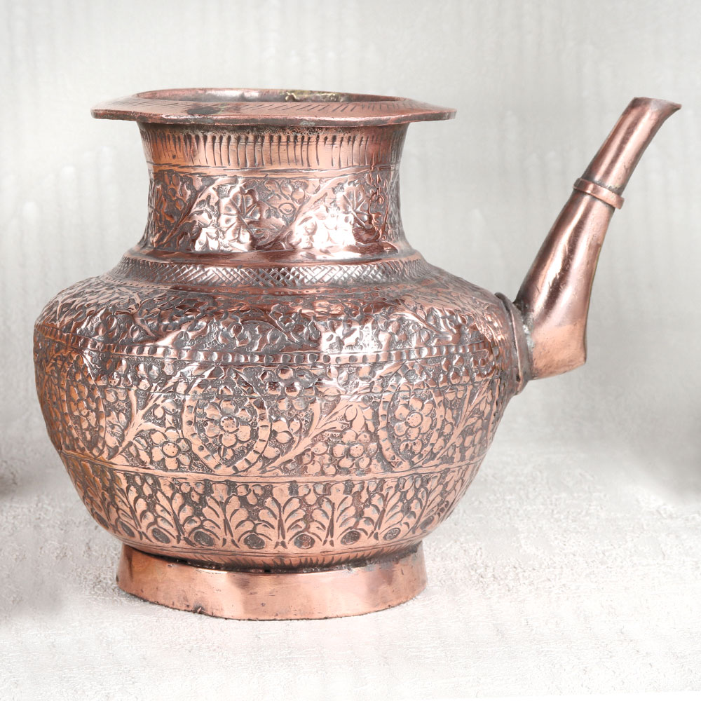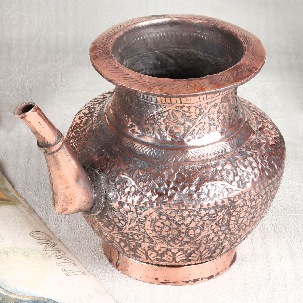 The Vintage Copper Water Pot with Spout adorned in an antique brown finish and meticulously engraved with captivating designs. Crafted by talented Indian artisans, this treasure hails from the illustrious tradition of Islamic Art in Hyderabad, where craftsmanship meets artistry. Fashioned from the finest quality copper, this pot exudes both historical charm and functional elegance. Its versatility knows no bounds - a splendid addition to your home, office, restaurant, hotel, or cafe. Place it in your prayer room to enhance the spiritual ambiance, or utilize it during rituals at the temple. The pot's allure extends beyond its utility, it serves as a magnificent display piece, captivating vintage collectors and becoming the centerpiece of exhibitions. Presenting this remarkable creation as a gift on special, festive, or auspicious occasions is an expression of both admiration and thoughtfulness. Its rich history and aesthetic beauty make it a treasure worth cherishing, reminding us of the artistry and craftsmanship of yesteryears. Embrace tradition with the Vintage Copper Water Pot with Spout, an embodiment of culture, heritage, and timeless elegance.