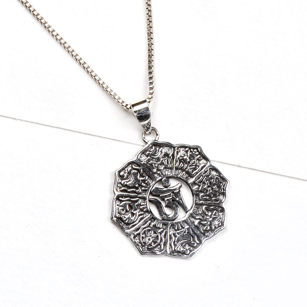 Auspicious 92.5 Sterling Silver pendant in a flower shape with a big aum in centre wit all the symbols of the zodiac signs on the top most border is made by expert craftsmen of India. The Perfect gift for your sister, friend , lover and mother on Diwali, Christmas, Engagements, New years eve, Valentine day, Raksha Bandhan and many such auspicious occasions.