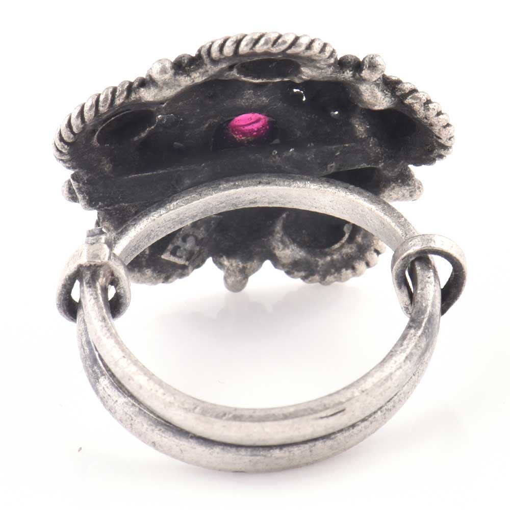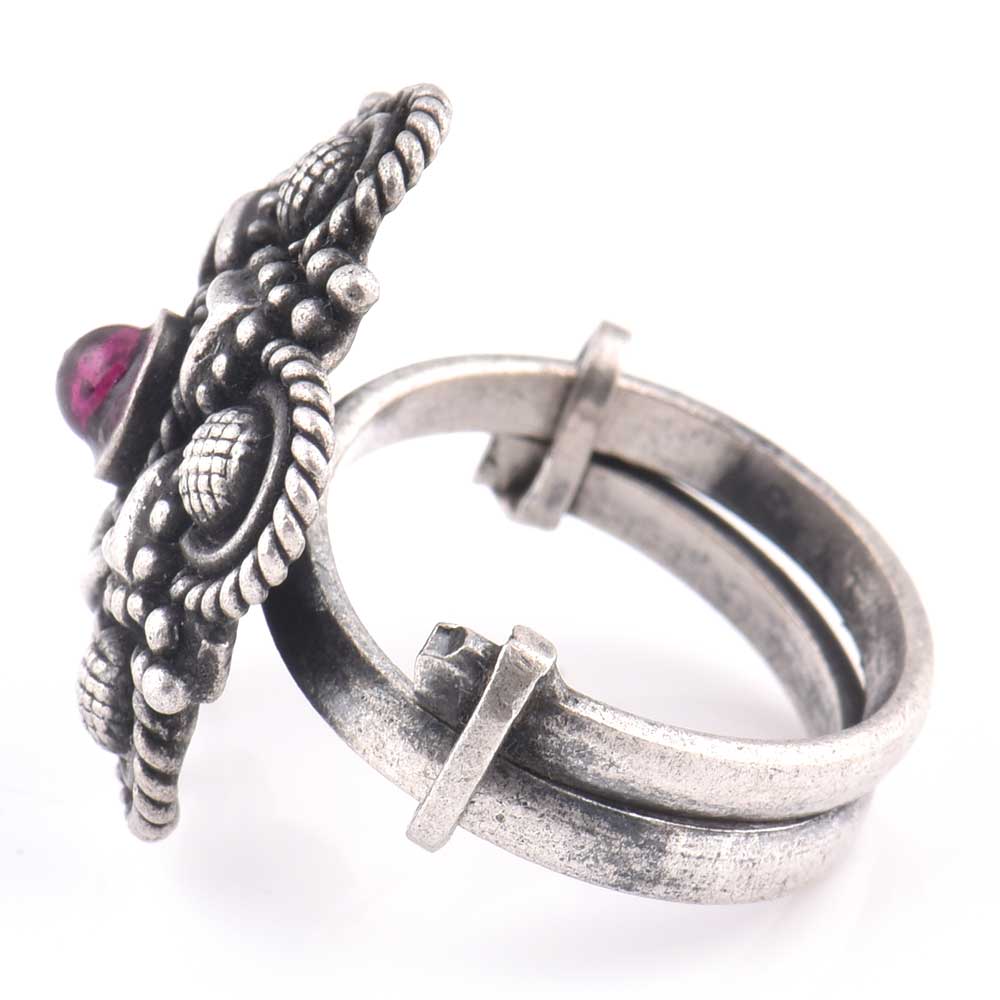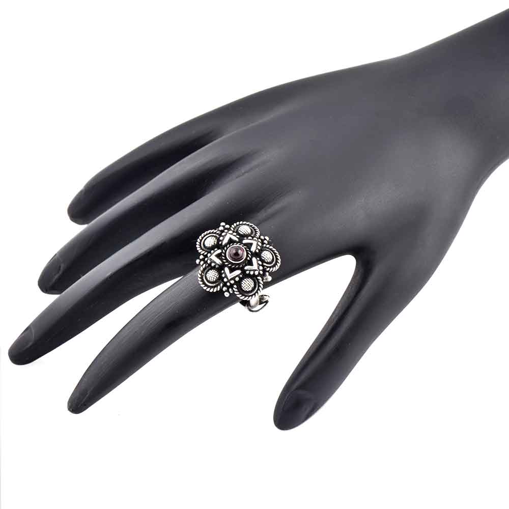 Floral design in centre 92.5 Sterling silver ring with chequered design on five corners is an exceptional design and is handmade by the master craftsmen of India .Make a difference by wearing this ring in a party , anniversary , special dinner, date or valentine party. Gift it to your friends, sister, mother and colleague, cousin or even your teenaged daughter.