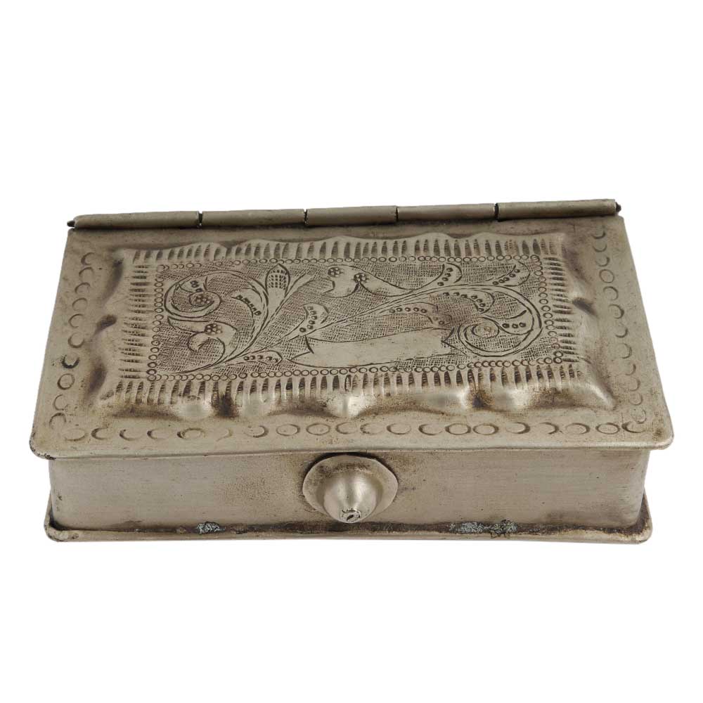 White metal floral design multi storage box has unique design and made by the master craftsmen of India. Use it as tobacco box, jewelry box, trinkets box, gift for your friends and relatives on wedding, anniversary and other special functions.