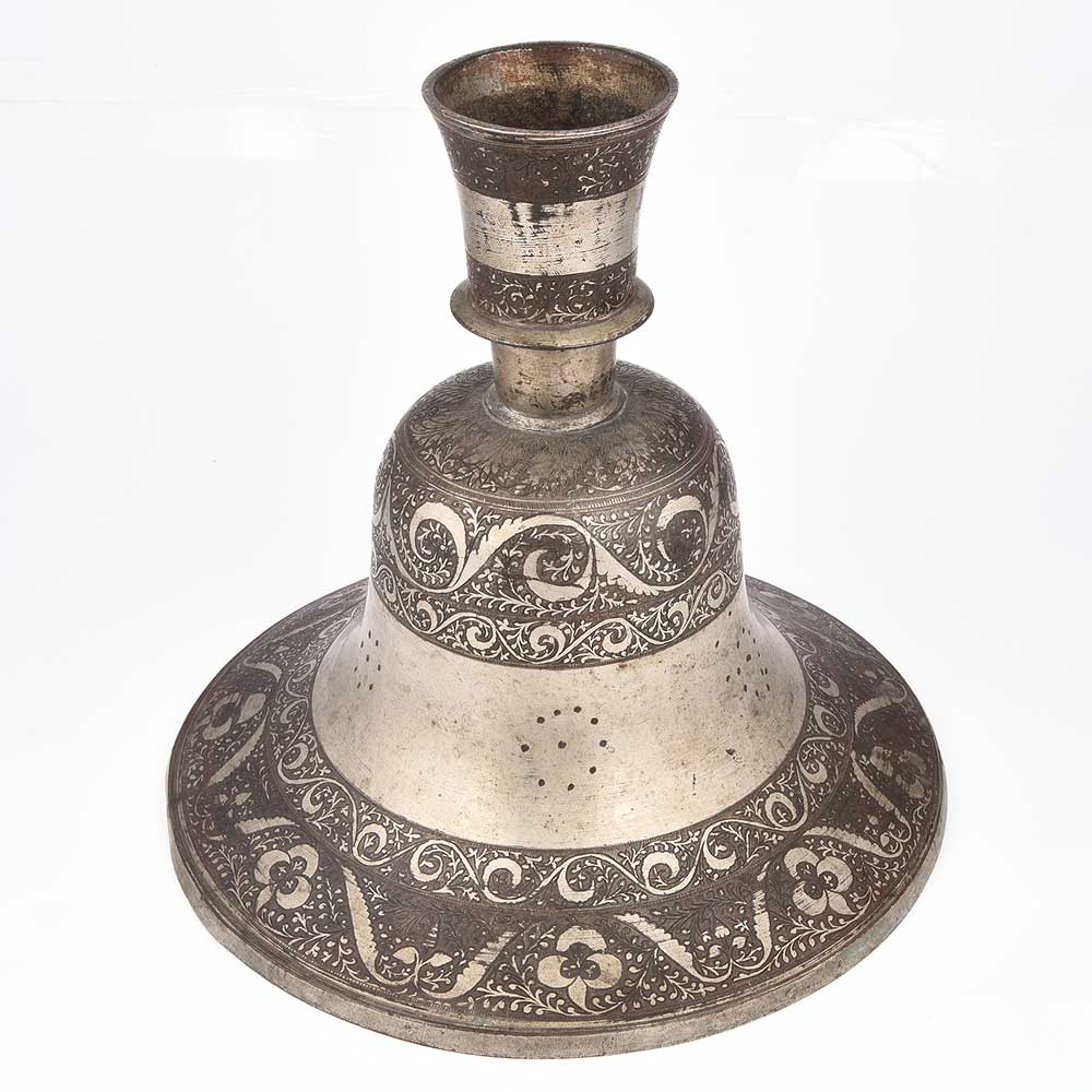 Candlestick Holder or Hookah Base, Incredibly Finely Floral Engraved Metal - Perhaps Silver Washed Brass, Beautiful Patina.