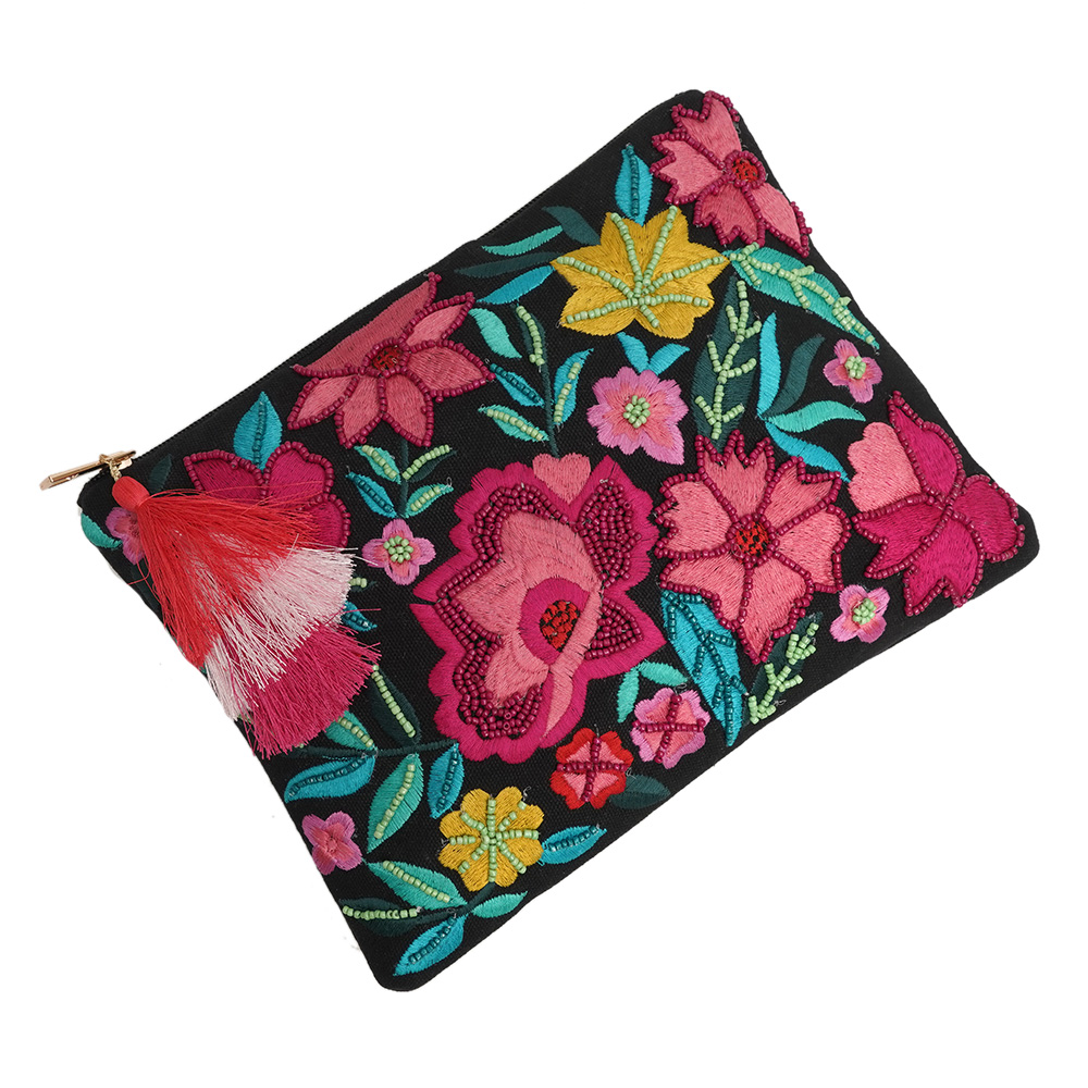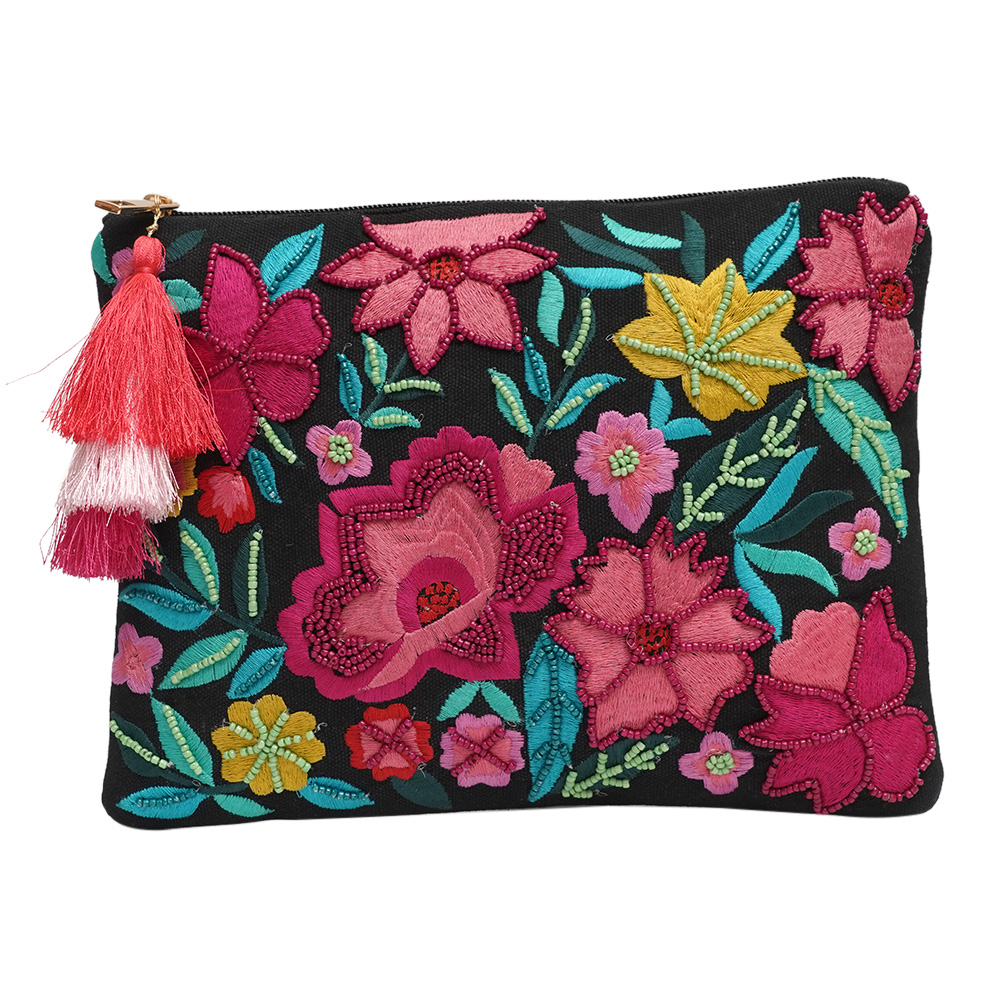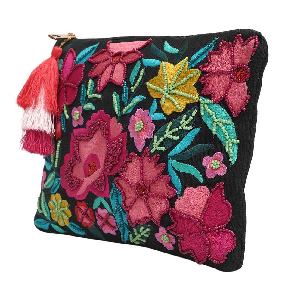 This clutch handbag is a unique and stylish accessory that is perfect for any occasion. Made from high-quality cotton and adorned with beautiful beads, this bag features a striking design of multi-colour flowers engraved on a black base with delicate leafs. Expertly handcrafted by skilled artisans, this bag is both sturdy and durable, making it a reliable option for women who need a dependable bag for their everyday needs. This bag is designed to be versatile and functional, making it suitable for a variety of situations. This cross body bag is an excellent gift option for family, friends, or relatives who appreciate unique and stylish accessories. Overall, it is a fantastic addition to the types of bags for women and side bags for women collection.