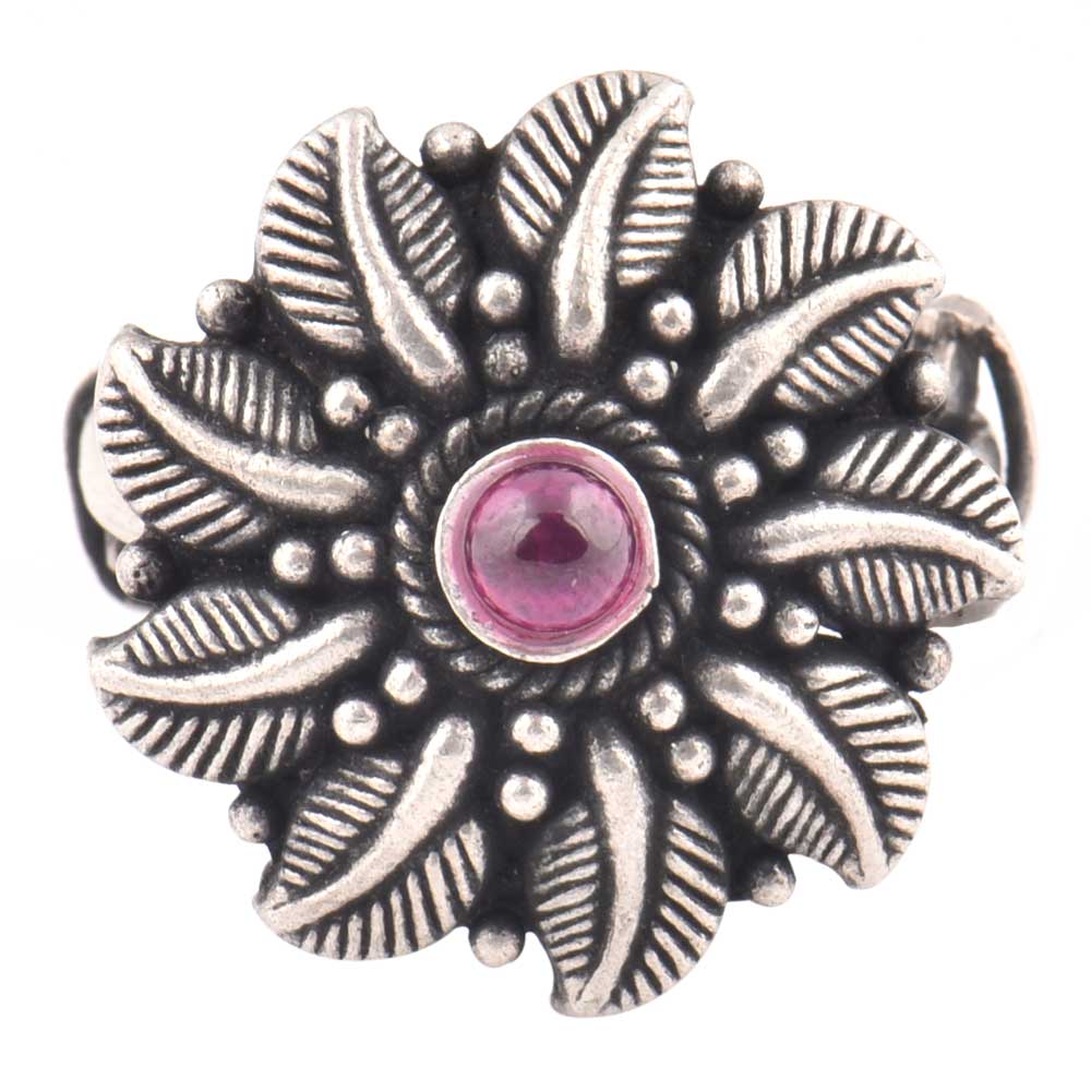 Always a favorite this 92.5 Sterling Silver ring is made of a round Amethyst stone in the centre surrounded with embossed silver leaves around the stone. Gift it to your sister, friends and that special friend as a token of love and affection .perfect accessory to match your wedding, anniversary or valentines outfit.