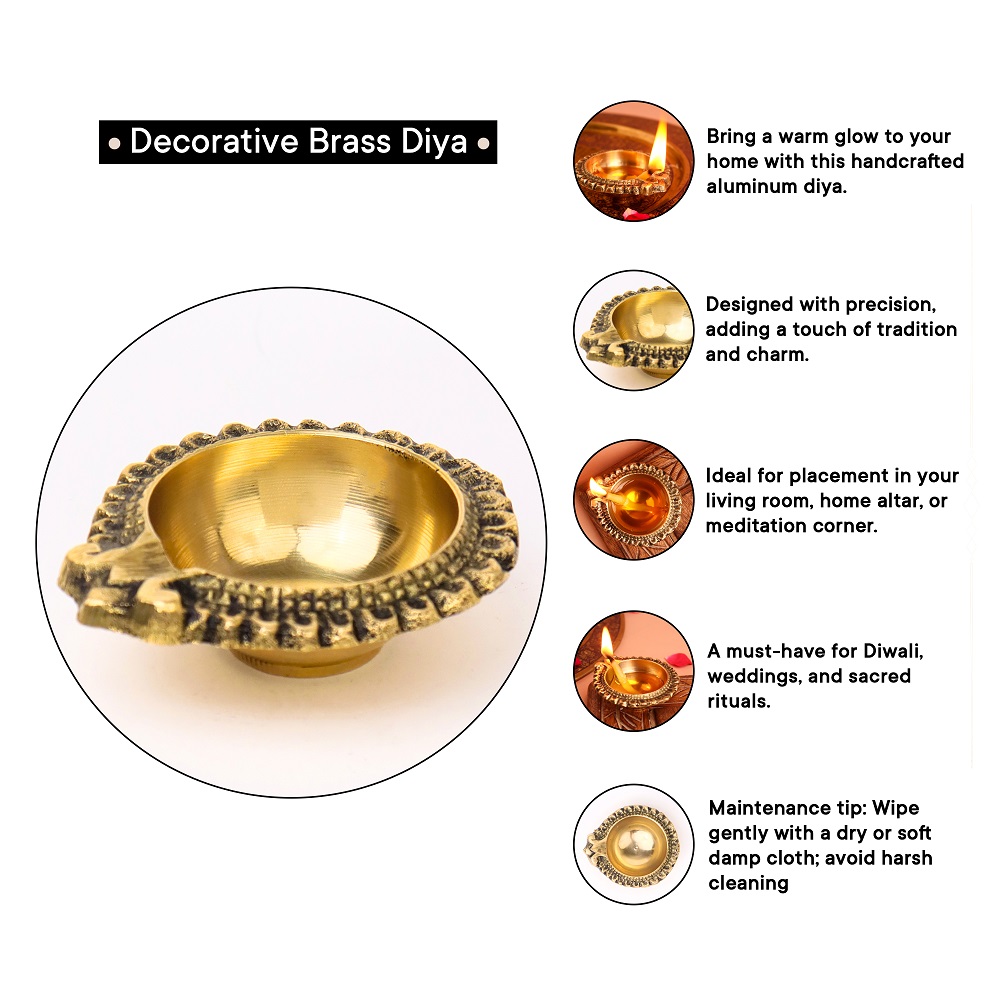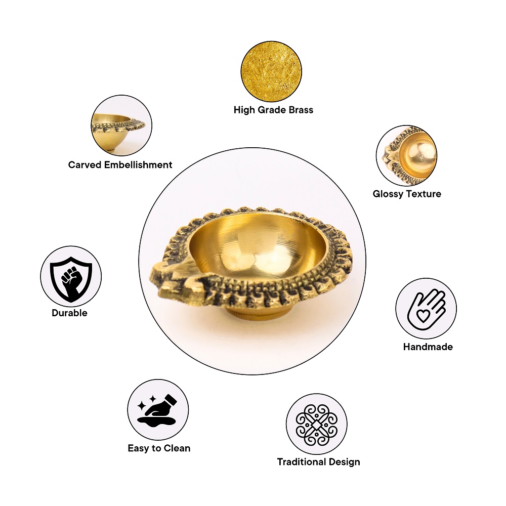 Bring divine radiance into your home with this Floral Round Brass Diya, a symbol of light, purity, and devotion. Handcrafted in solid brass with a polished golden finish, its delicate floral pattern adds elegance to traditional rituals. Compact yet striking, this diya is perfect for Diwali, daily puja, or as a sacred accent in your mandir and living spaces.