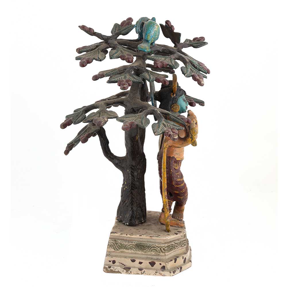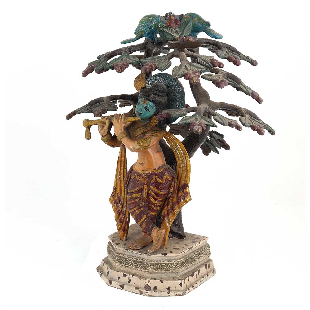 Perfect for your holy puja room or as a decor piece in the living room, this Brass statue of Lord Krishna playing his flute standing under an brass tree is heavenly and awe-inspiring. Handmade in the antique style, the beauty of the artistry work is exemplified in the union of various materials to highlight the different aspects of the item. It is equally deserving as a gifting item.