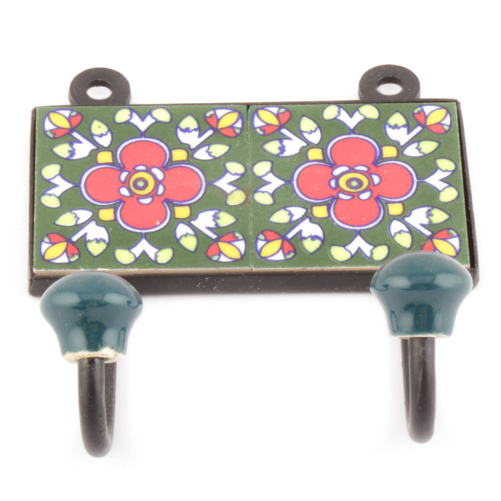 Forest Green And Red Ceramic Floral Tiles Hooks Online. When Put on Wall or Cabinet it is an Art in itself. The Metal Part of this Hook is Black Powder Coated.