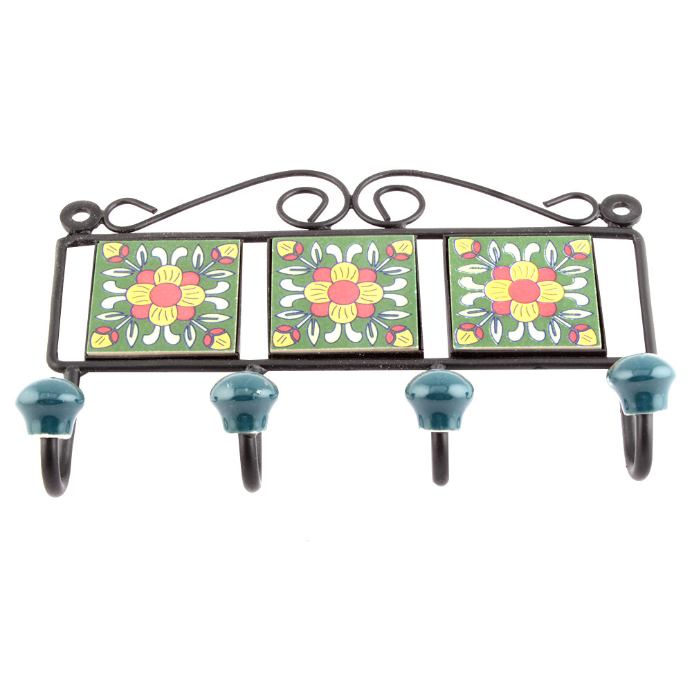 Forest Green And Yellow Floral Tiles Hooks. When Put on Wall or Cabinet it is an Art in itself. The Metal Part of this Hook is Black Powder Coated.
