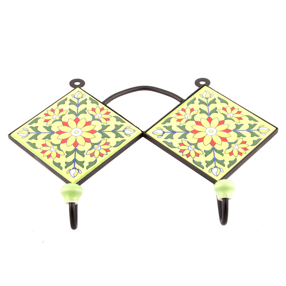 Forest Green And Yellow Sun Flower Tiles Hooks. When Put on Wall or Cabinet it is an Art in itself. The Metal Part of this Hook is Black Powder Coated.