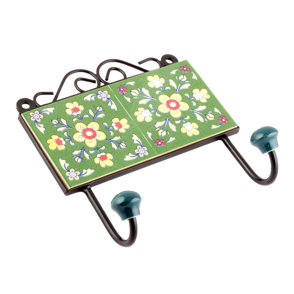 Forest Green Ceramic Flower Tiles Hooks. When Put on Wall or Cabinet it is an Art in itself. The Metal Part of this Hook is Black Powder Coated.