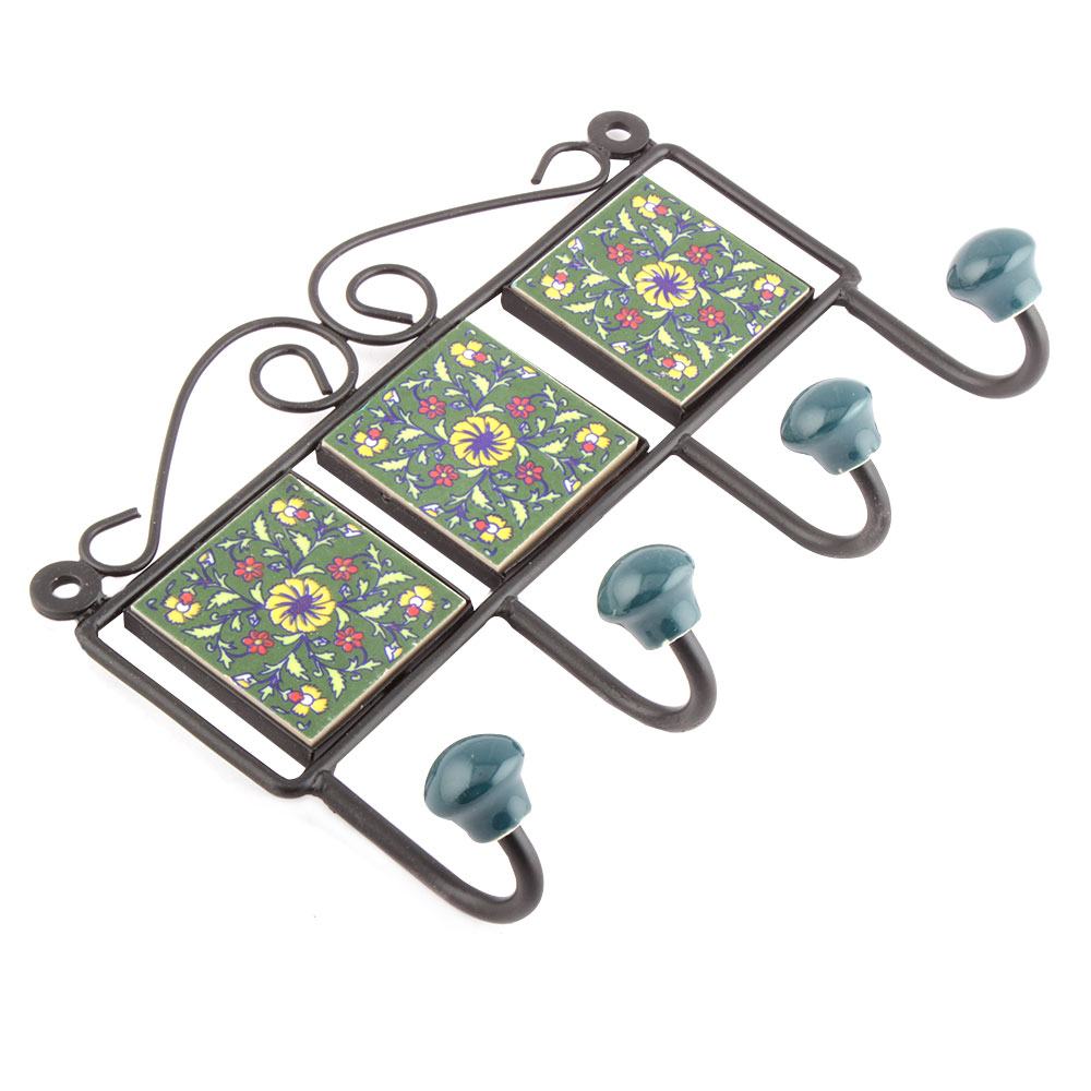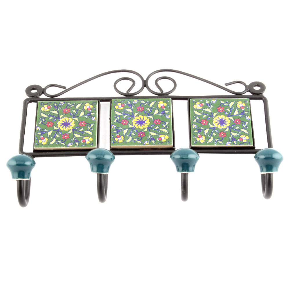 Forest Green And Yellow Wheel Flower Tiles Hooks. When Put on Wall or Cabinet it is an Art in itself. The Metal Part of this Hook is Black Powder Coated.