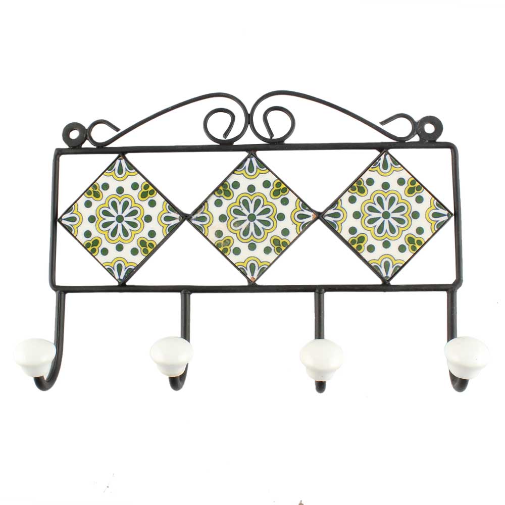 Forest Green Ceramic Floral Tile Hook. When Put on Wall or Cabinet It is An Art in Itself. The Metal Part of this Hook is Black Powder Coated.