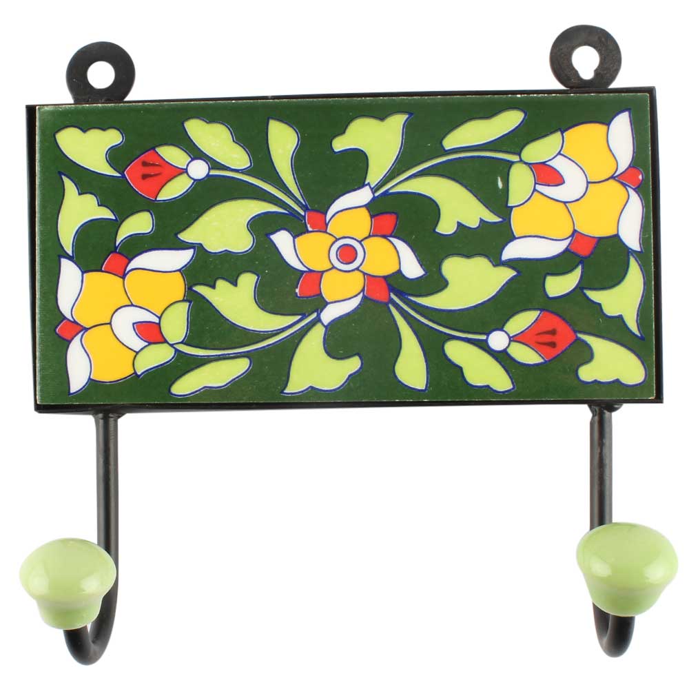 Forest Green Ceramic Floral Tile Hook. When Put on Wall or Cabinet It is An Art in Itself. The Metal Part of this Hook is Black Powder Coated.