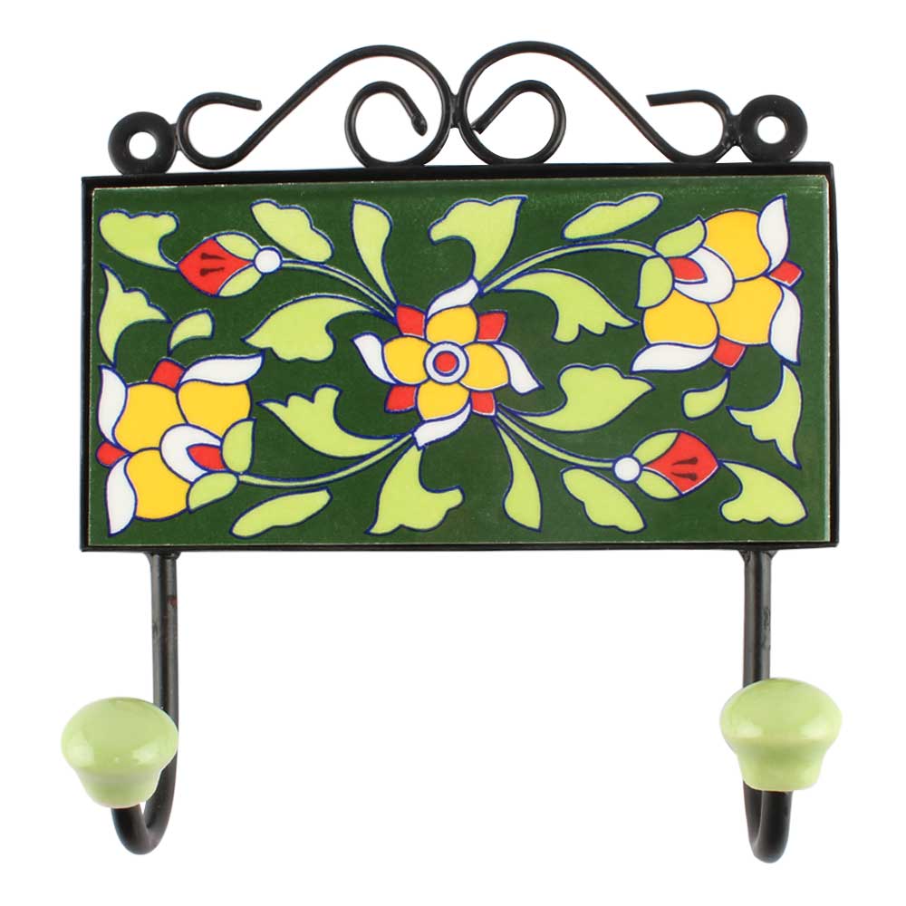 Forest Green Ceramic Floral Tile Hook. When Put on Wall or Cabinet It is An Art in Itself. The Metal Part of this Hook is Black Powder Coated.