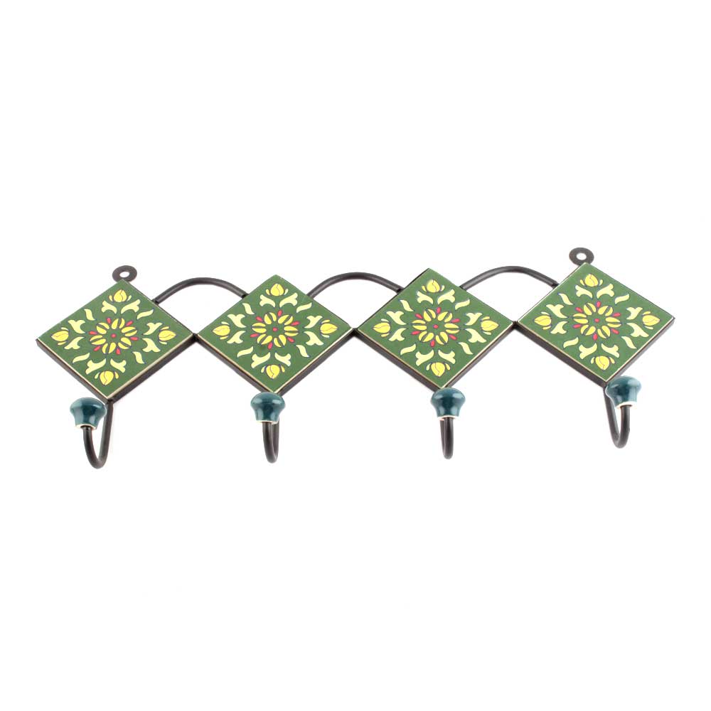Forest Green Ceramic Floral Tiles Hooks. When Put on Wall or Cabinet It is An Art in Itself. The Metal Part of this Hook is Black Powder Coated.