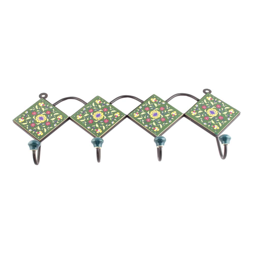 Forest Green Ceramic Floral Tiles Hooks. When Put on Wall or Cabinet It is An Art in Itself. The Metal Part of this Hook is Black Powder Coated.
