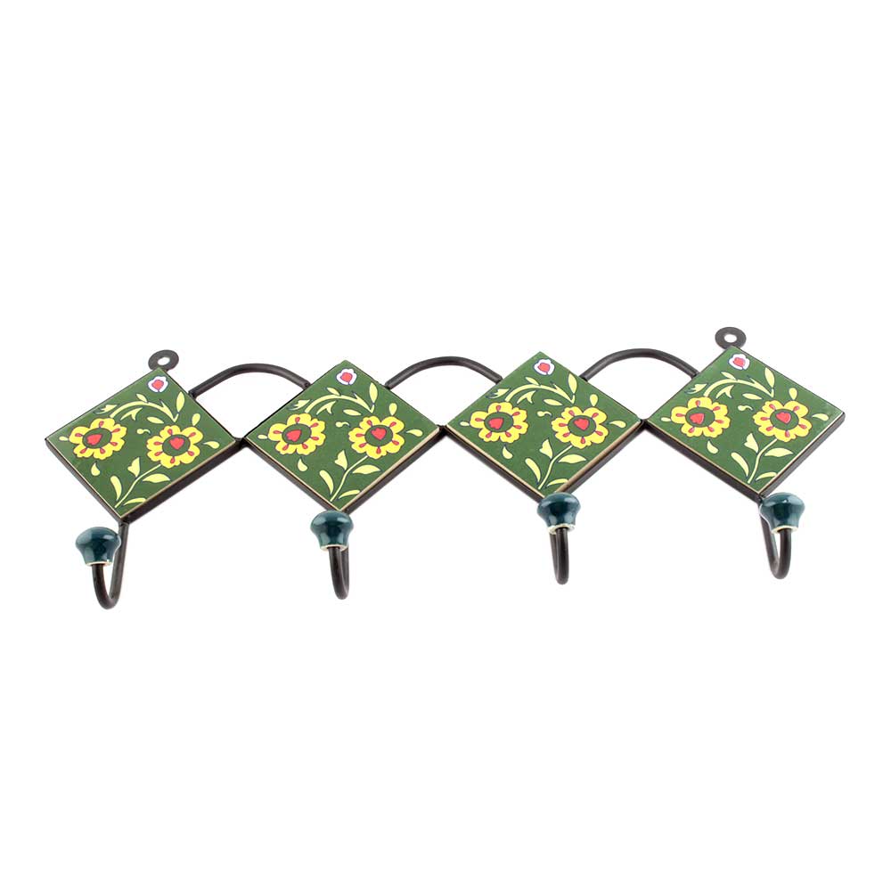 Forest Green Ceramic Floral Tiles Hooks. When Put on Wall or Cabinet It is An Art in Itself. The Metal Part of this Hook is Black Powder Coated.
