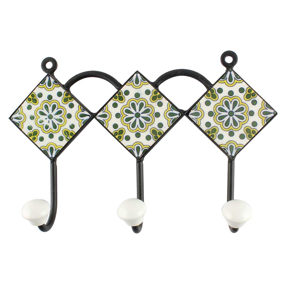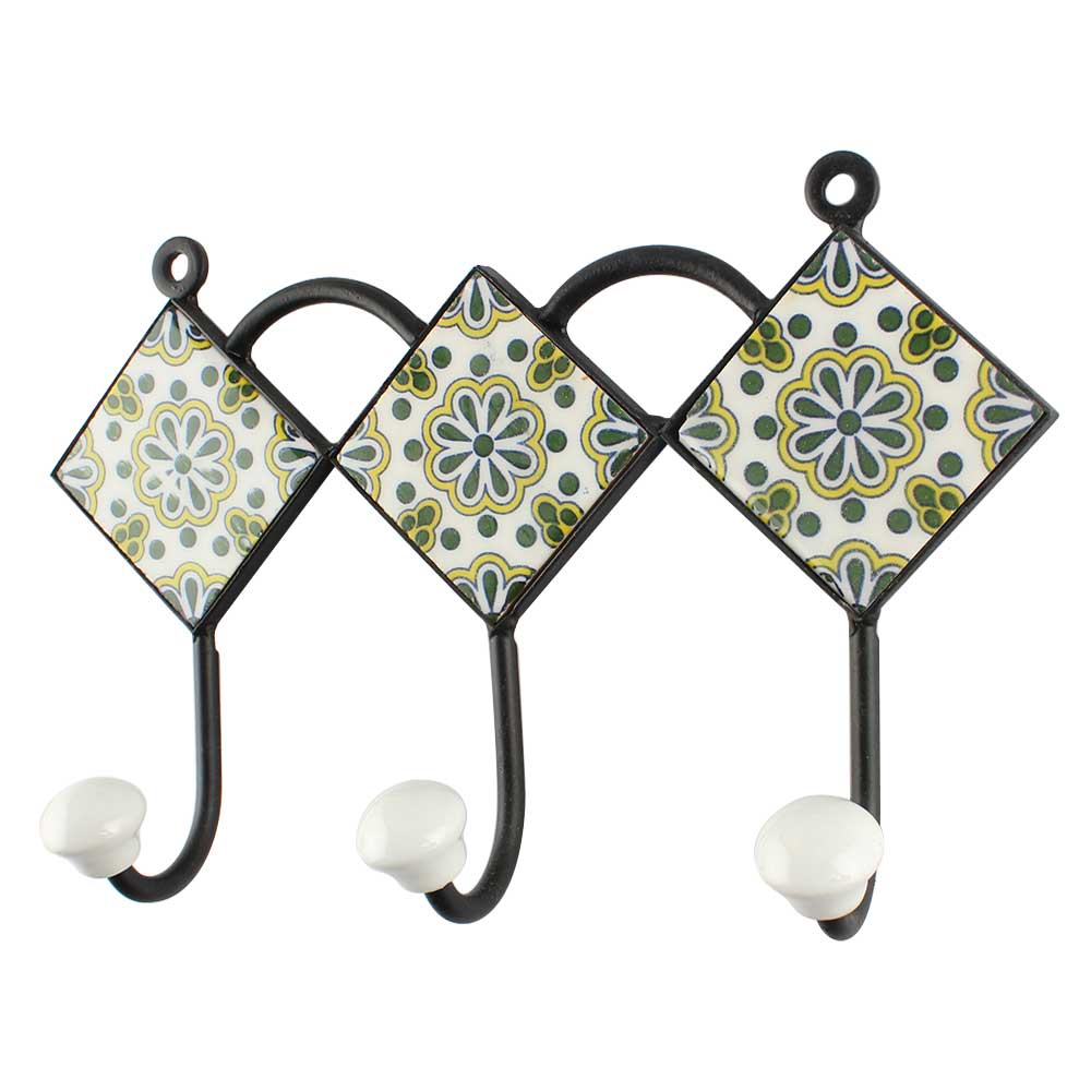 Forest Green Flower Ceramic Tile Hook Online. When Put on Wall or Cabinet It is An Art in Itself. The Metal Part of this Hook is Black Powder Coated.