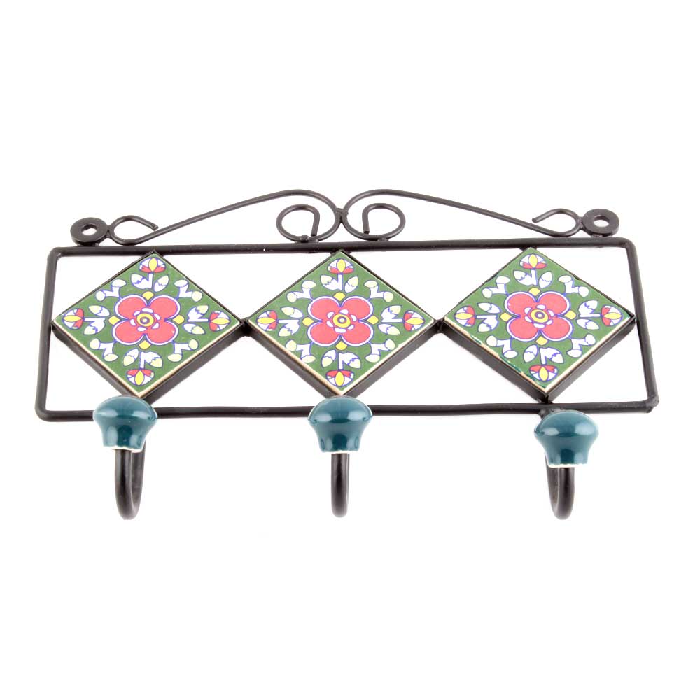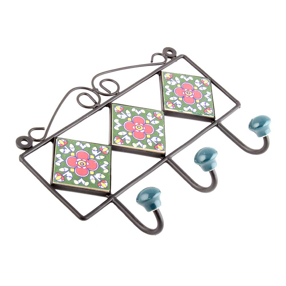 Forest Green Red Floral Tiles Hooks.When Put on Wall or Cabinet it is an Art in itself. The Metal Part of this Hook is Black Powder Coated.