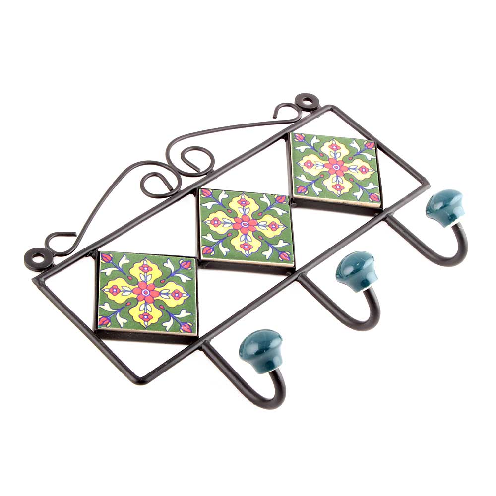 Forest Green Red Tiny Flower Tiles Hooks.When Put on Wall or Cabinet it is an Art in itself. The Metal Part of this Hook is Black Powder Coated.