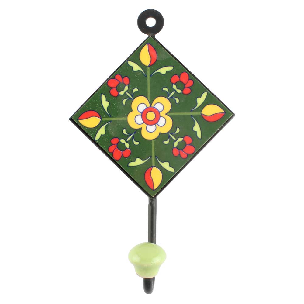 Forest Green Tiny Flower Ceramic Tile Hook. When Put on Wall or Cabinet It is An Art in Itself. The Metal Part of this Hook is Black Powder Coated.