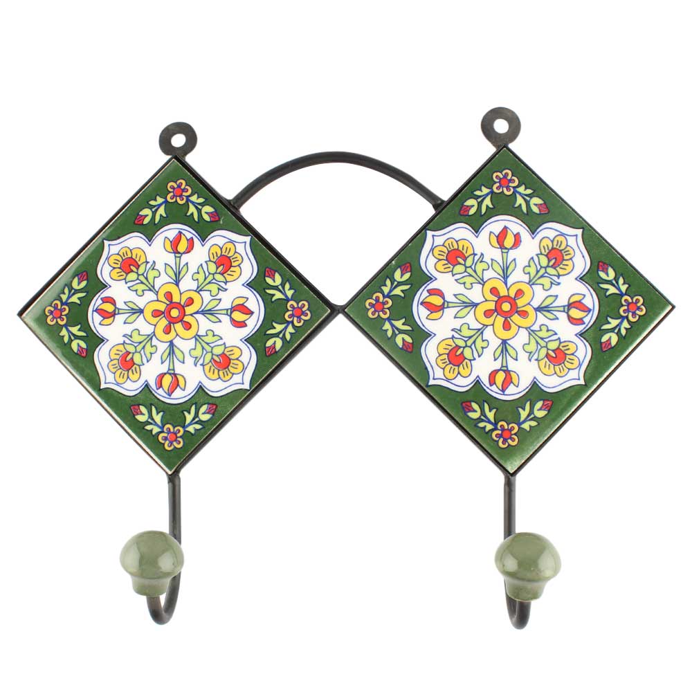 Forest Green With White Floral Ceramic Tile Hook Online. When Put on Wall or Cabinet It is An Art in Itself. The Metal Part of this Hook is Black Powder Coated.
