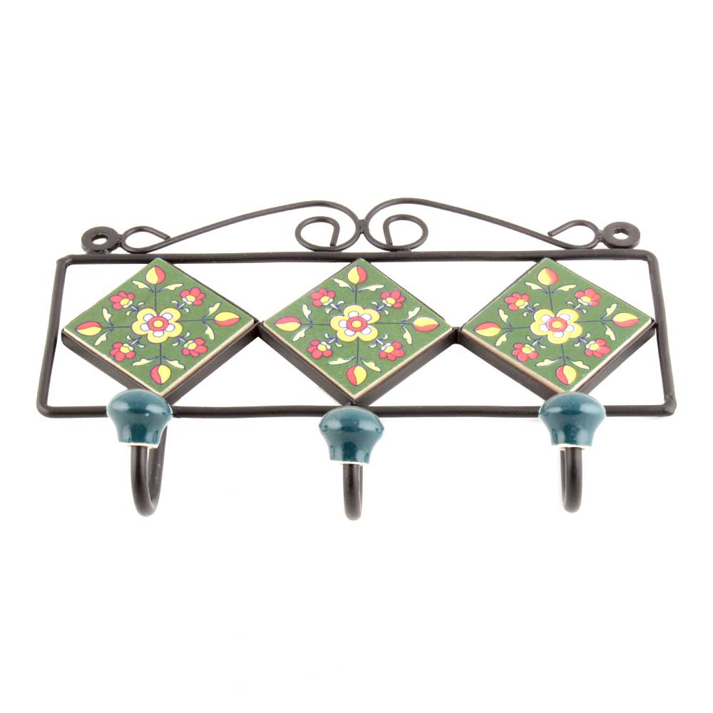 Forest Green Yellow Floral Tiles Hooks.When Put on Wall or Cabinet it is an Art in itself. The Metal Part of this Hook is Black Powder Coated.