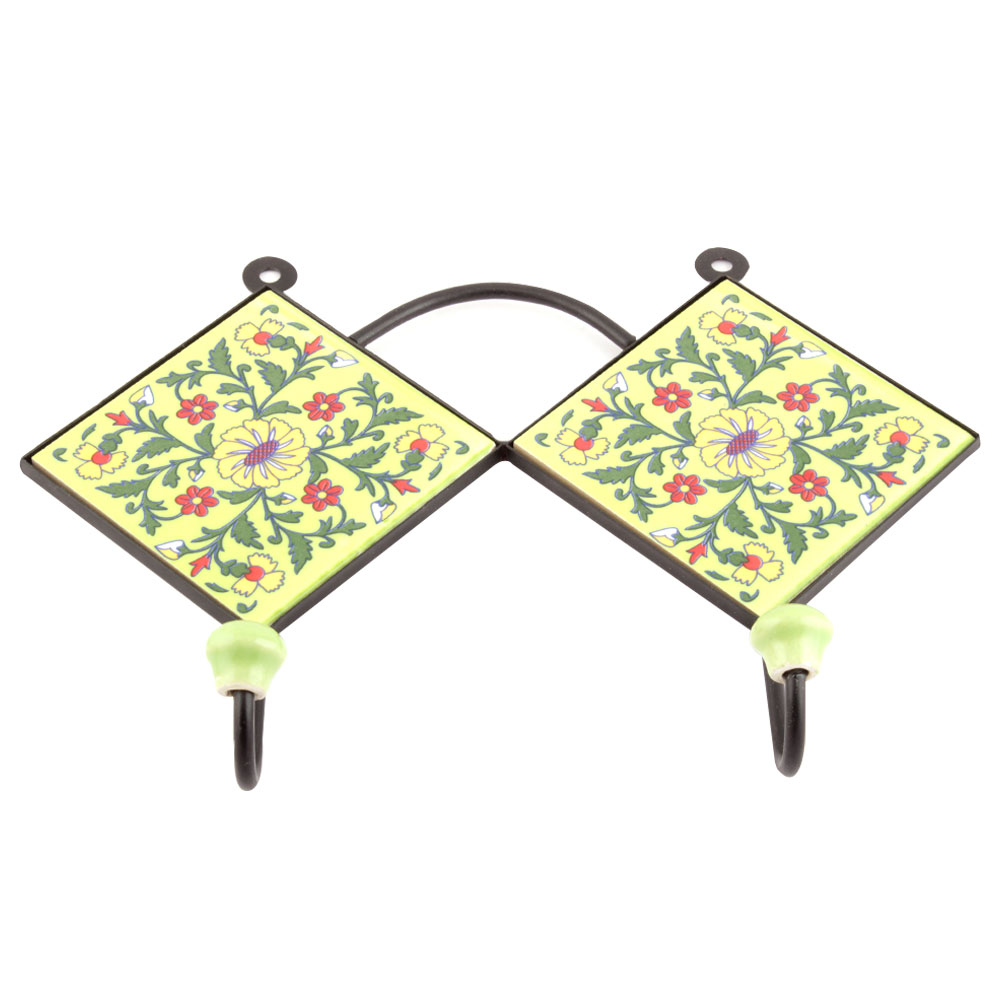 Forset Green And Yellow Wheel Flower Tiles Hooks. When Put on Wall or Cabinet it is an Art in itself. The Metal Part of this Hook is Black Powder Coated.