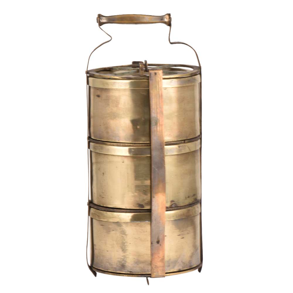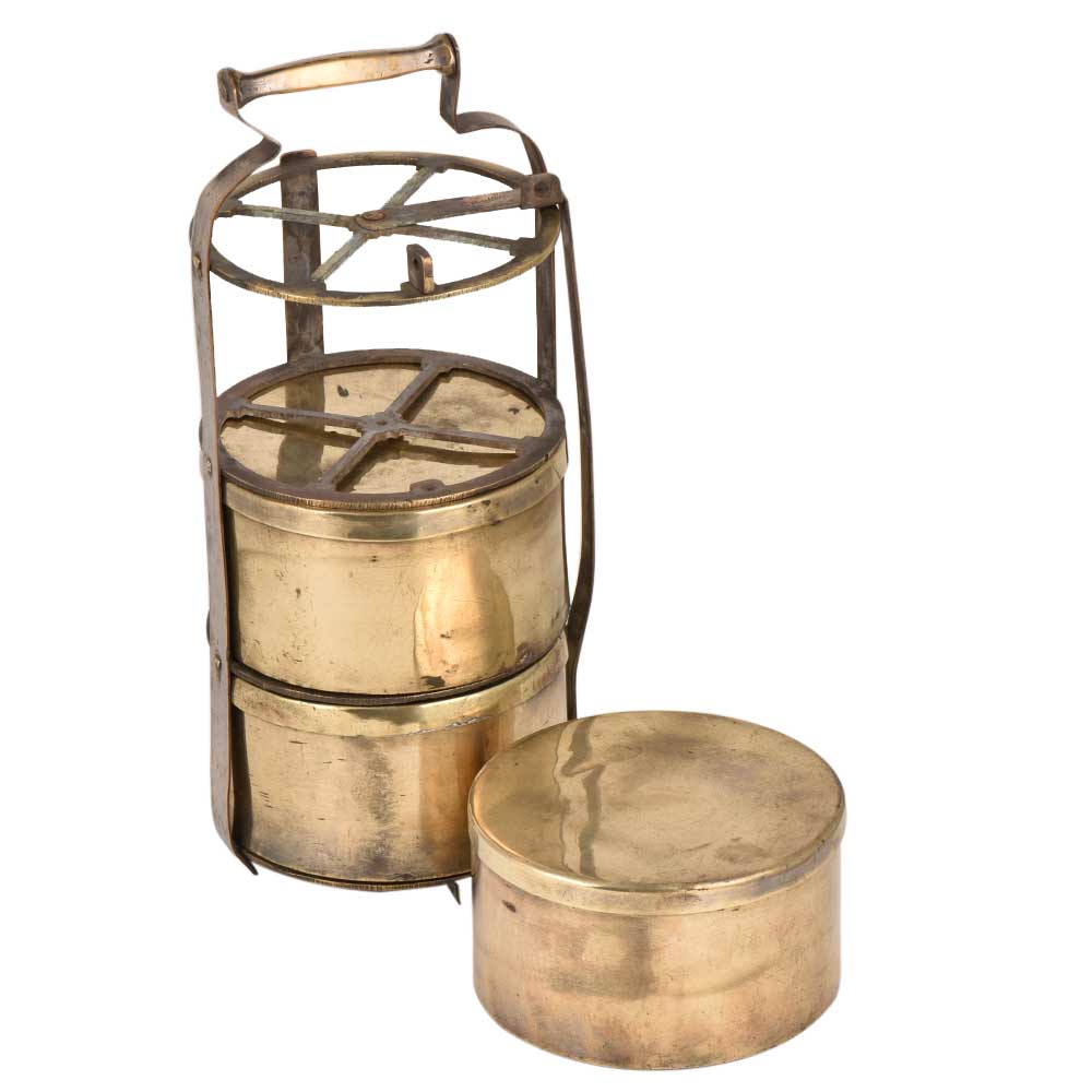 Handmade cross design frame Brass Tiffin Box to store with three spacious containers. Each container has its own lid. They are fixed together with the help of brass frame with three sides and U Shaped handle