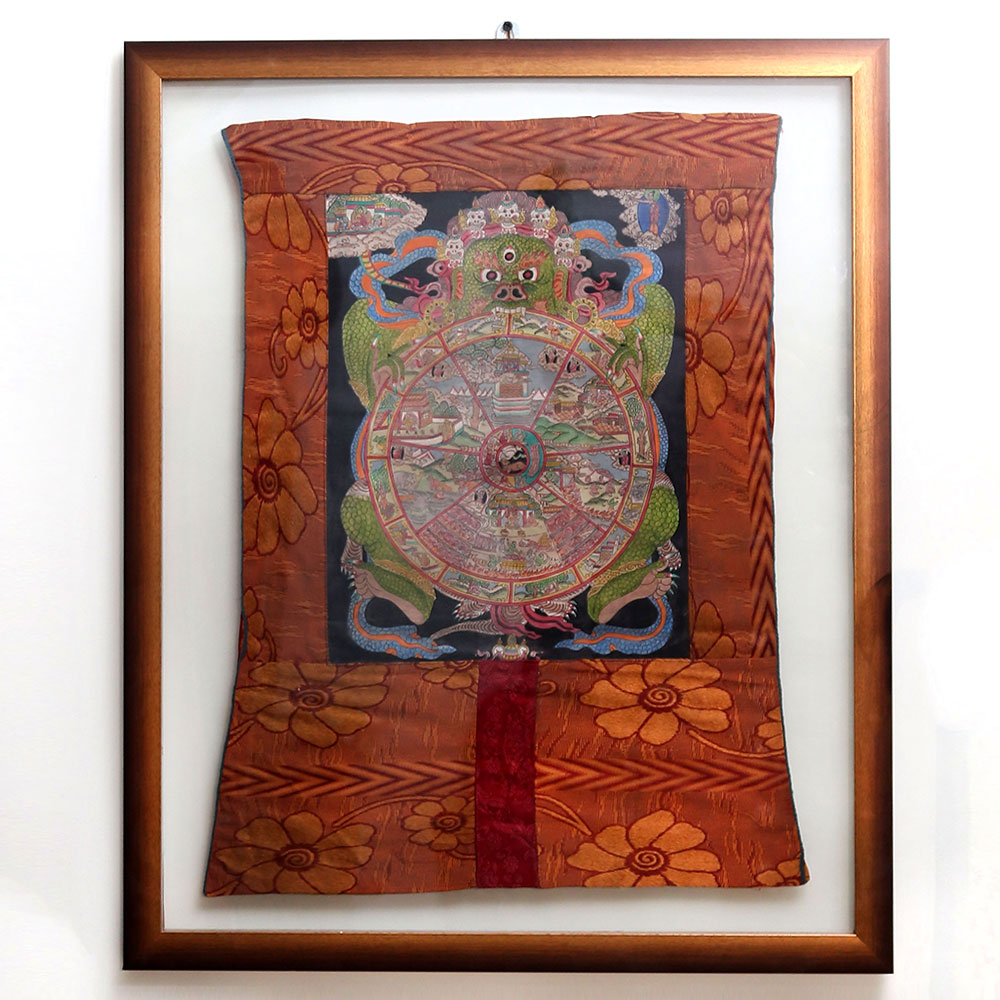 In the Tibetan Buddhist world view, the six realms of existence (Gods, demigods, humans, animals, hungry ghosts, and hell-beings) are all held in the grasp of the Lord of Death. In the center of the wheel are the three root poisons of desire, hatred, and ignorance symbolized by the cock, snake, and pig, and on the outer rim are the twelve links of dependent origination by which all causes and effects are determined.