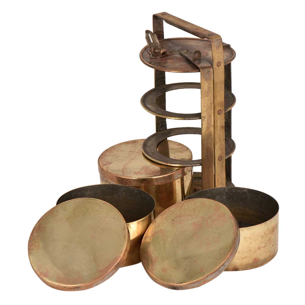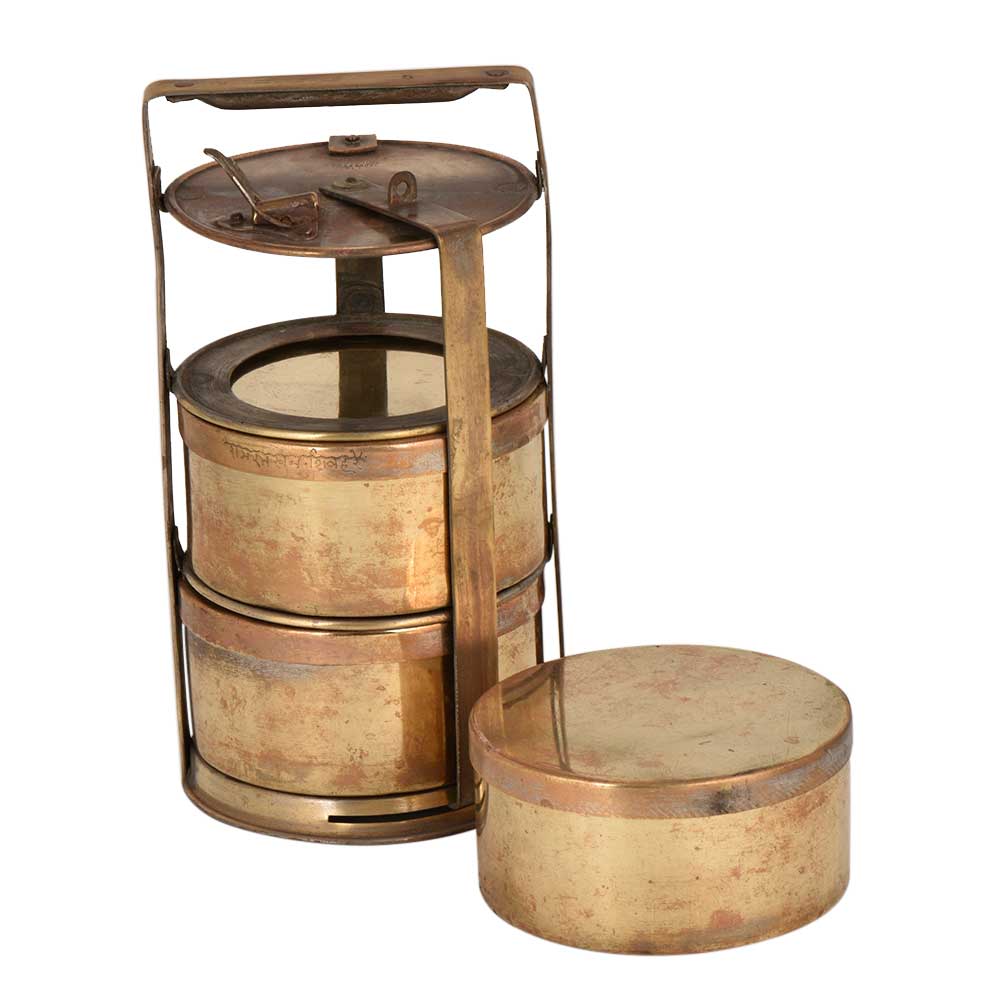 Functional brass Tiffin box with three containers and a thick locking frame that keeps the containers intact. It has a traditional lock on the upper container and a three ring frame .Each container is place in the ring and then locked. Use it as showpiece , table decoration in hotels ,restaurants , corporate gift , gift for your near and dear ones.