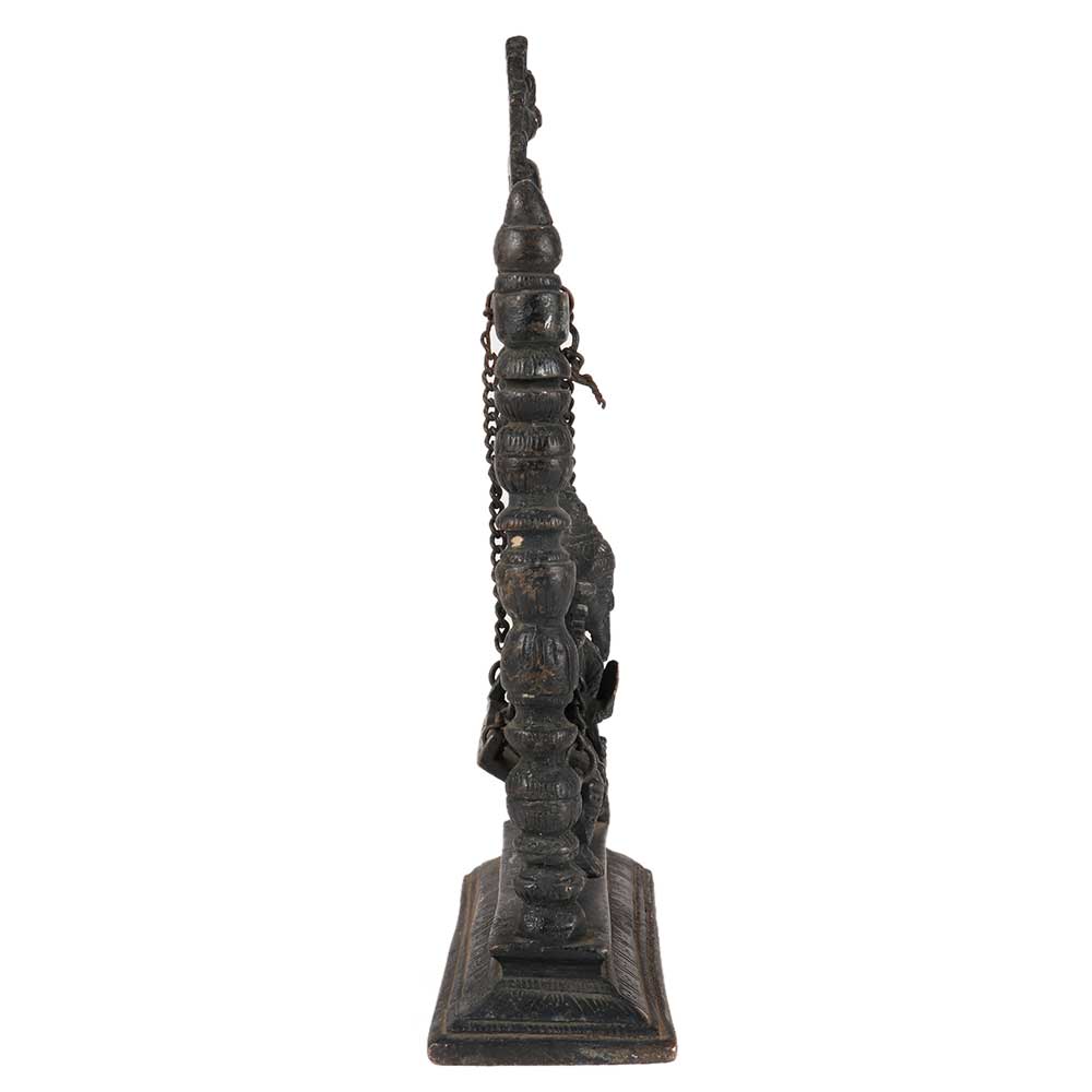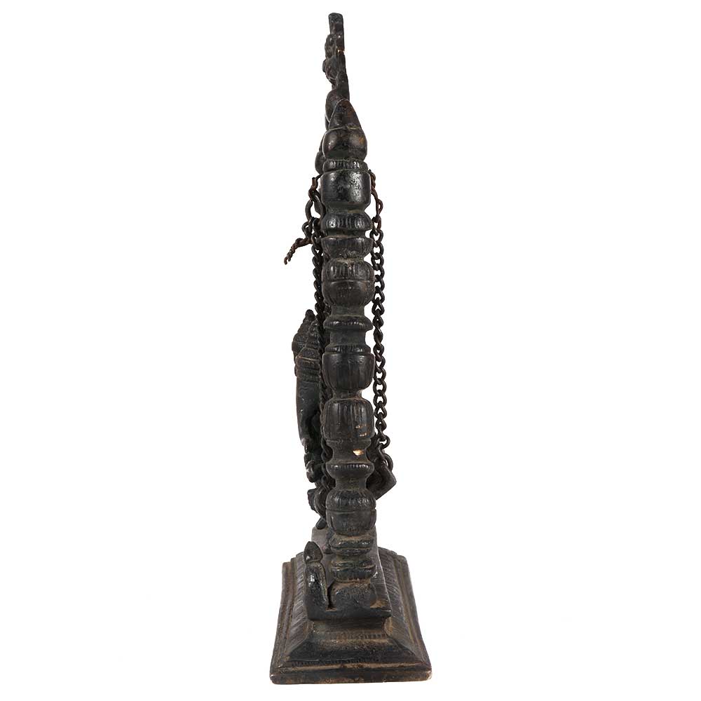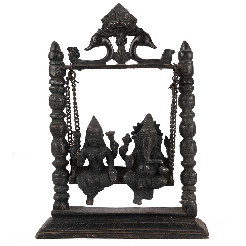 Beautifully crafted brass idol of Goddess Lakshmi and God Ganesha seated on a swing is beautifully crafted. The gods sit serenely with one leg folded, both pouring favors and wealth. The swing is exquisitely crafted, with a peacock motif on the top and long pillars on both sides.