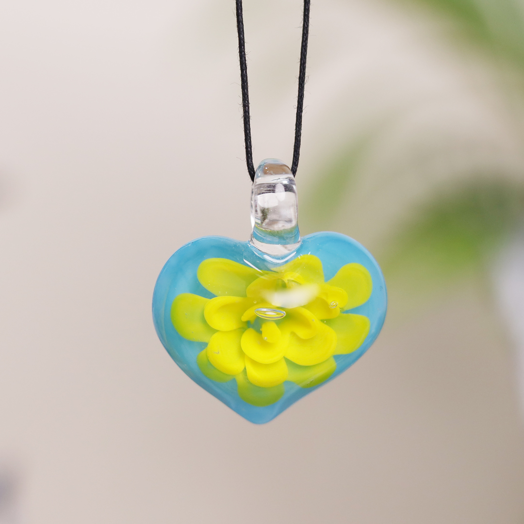 Add a touch of artistic brilliance to your jewelry collection with this Lampwork Yellow Flower Engraved Glass Pendant, meticulously handcrafted in turquoise-toned glass. The pendant captures the timeless allure of lampwork artistry — featuring a delicate yellow flower encapsulated within clear glass, radiating charm, grace, and serenity. Each pendant is a miniature artwork, symbolizing nature’s bloom and the enduring beauty of handmade craft.
