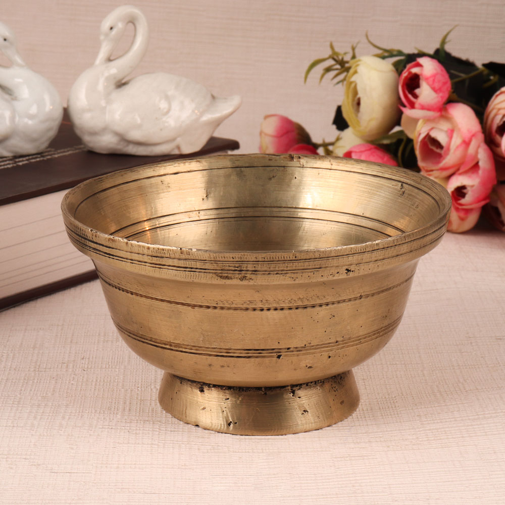 Add a touch of elegance and spirituality to your home with this gorgeous South Indian brass bowl. This handmade bowl is typically used for kumkum tilak during religious ceremonies and is a symbol of divinity and auspiciousness. The intricate and shiny design is sure to grab the attention of any visitor and is perfect for displaying as a decorative item. Collectors of vintage items will love this beautiful piece that captures the essence of South Indian art and tradition. It's not just a bowl but a reminder of the rich cultural heritage of India. You can also gift this incredible item to your loved ones on special or festive occasions.