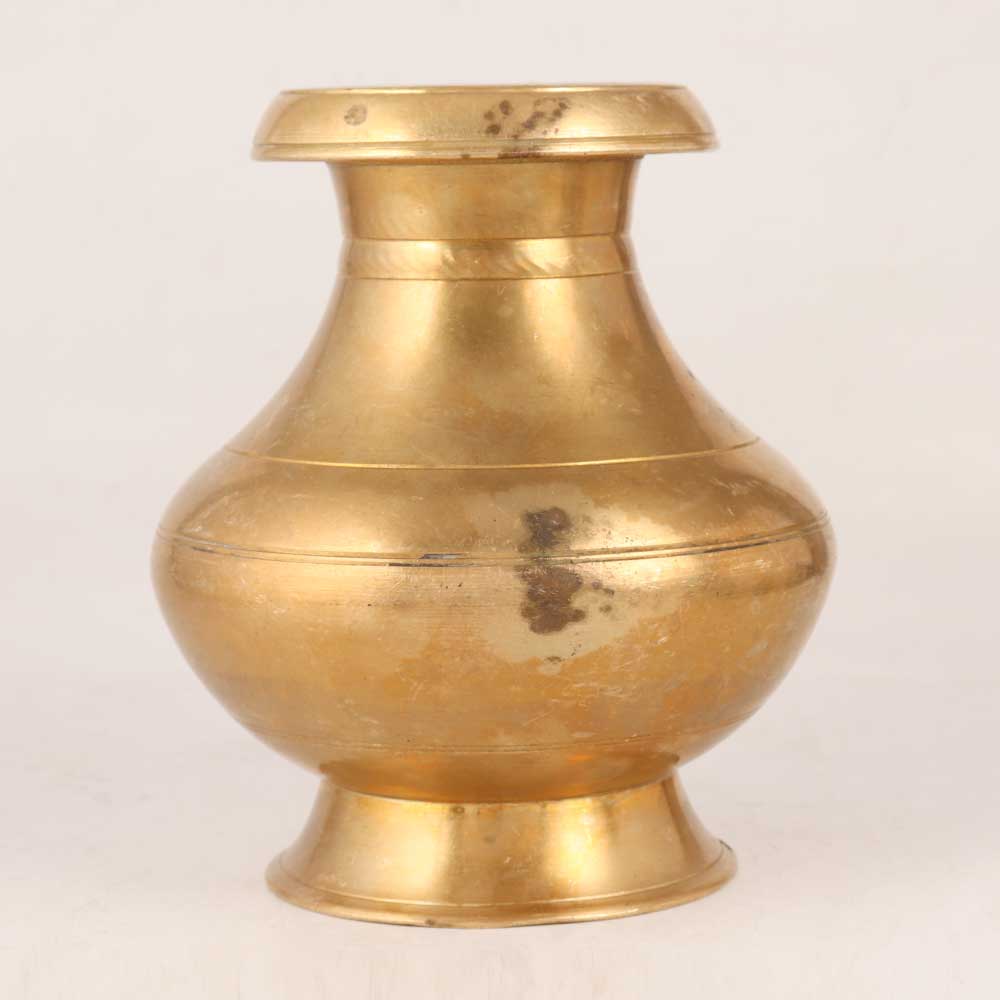 This brass holy water pot with a delicately crafted spout is a masterpiece of artistry and devotion. Skillfully handmade by talented Indian craftsmen, this exquisite piece is crafted with meticulous attention to detail, using high-quality brass for a lustrous and antique golden finish that exudes elegance and grandeur. Versatile in its application, this holy water pot finds a cherished place in any setting, be it your home, office, restaurant, hotel, or cafe. Its presence instantly elevates the ambiance, adding a touch of sacred beauty to any space. At exhibitions, it becomes a captivating focal point, impressing visitors with its intricate design and cultural significance. Embracing a deep-rooted tradition, this brass water pot is not only a decorative item but also a medium for offering blessings to devotees. Pouring water from the elegantly crafted spout symbolizes bestowing spiritual purification and good fortune upon the faithful. Moreover, this divine creation serves as a thoughtful and heartfelt gift for your loved ones on special, festive, or auspicious occasions. By presenting them with this sacred treasure, you impart your warm wishes and share the essence of spirituality and artistry. Embrace the sacred aura and cultural heritage with this brass holy water pot, a treasure to be cherished for generations to come.