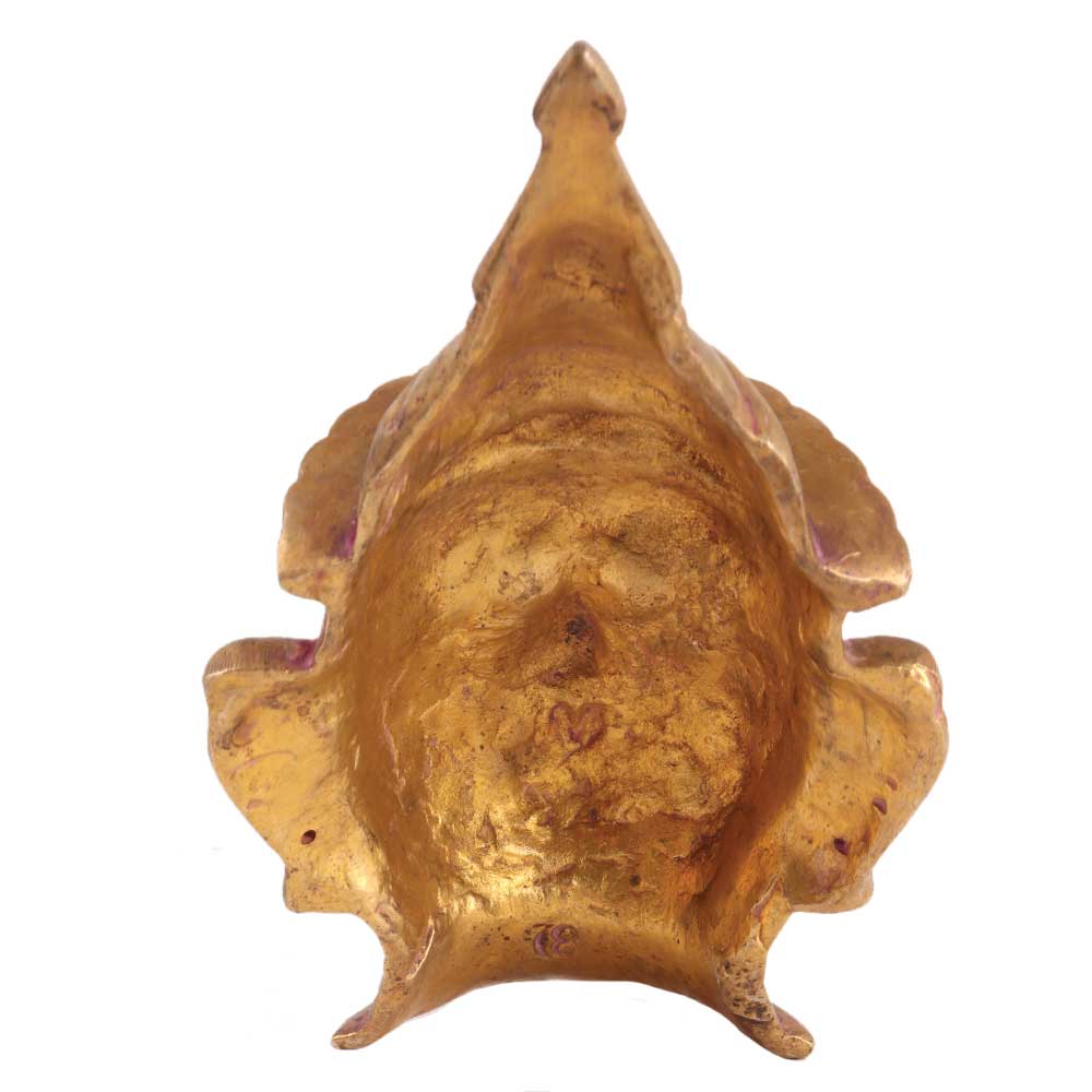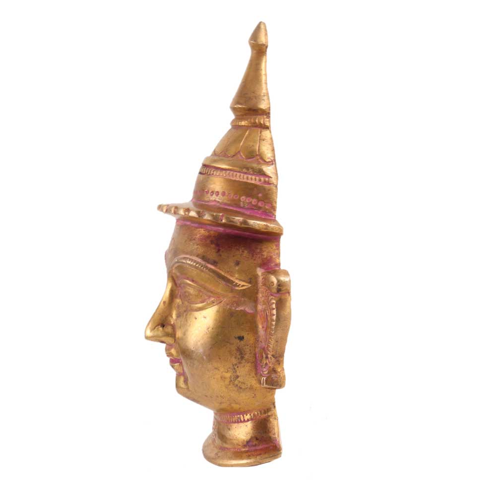 Shiva is portrayed as a warrior on this grand and exquisite solid brass mask. It is most likely from the late nineteenth century, though it could be older. A third eye on the forehead, huge almond eyes, a prominent nose, and a fine moustache are all notable aspects of the figure's expressive face. The lips are thin but protrude outward. Fantastic present for treasured relatives and friends.