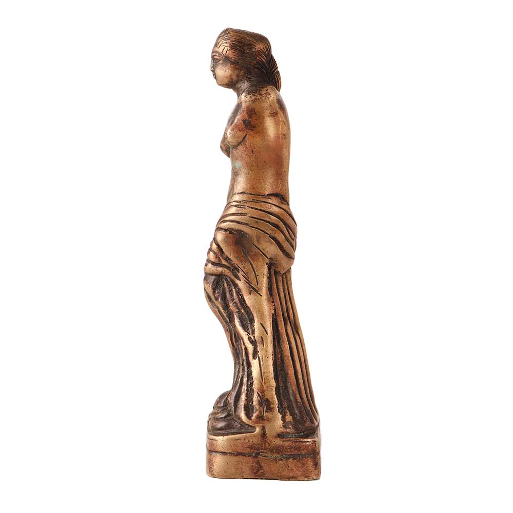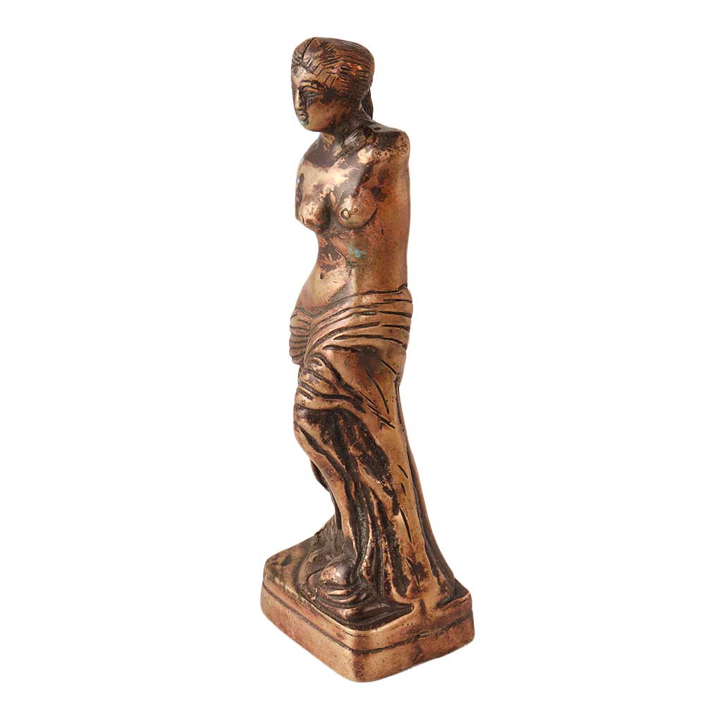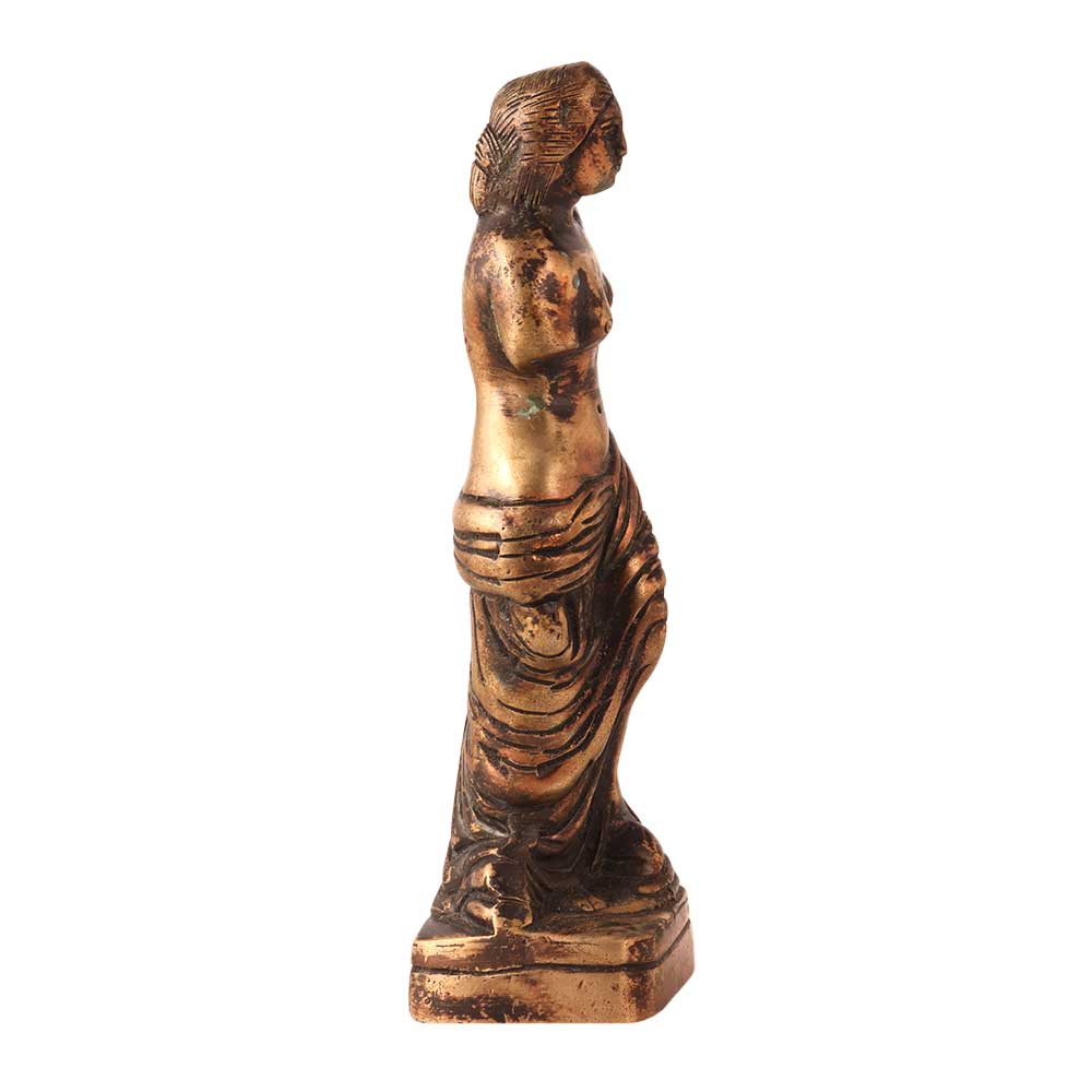 The Venus de Milo is a famous ancient Greek statue depicting the goddess Aphrodite (known as Venus in Roman mythology) The Venus de Milo is notable for its striking beauty and the graceful, flowing lines of the figure's form. The statue is particularly famous for its lack of arms, which were likely lost or damaged over the centuries. Despite this, the Venus de Milo remains one of the most celebrated examples of ancient Greek sculpture, admired for its masterful craftsmanship and enduring elegance. The Goddess of beauty and love is the epitome of the perfect female form; she is portrayed almost nude with her sinuous-shaped body, and she is posed in a traditional S-curve to show off her aesthetic allure. This fine sculpture is created from brass that has been given a dark brown patina.