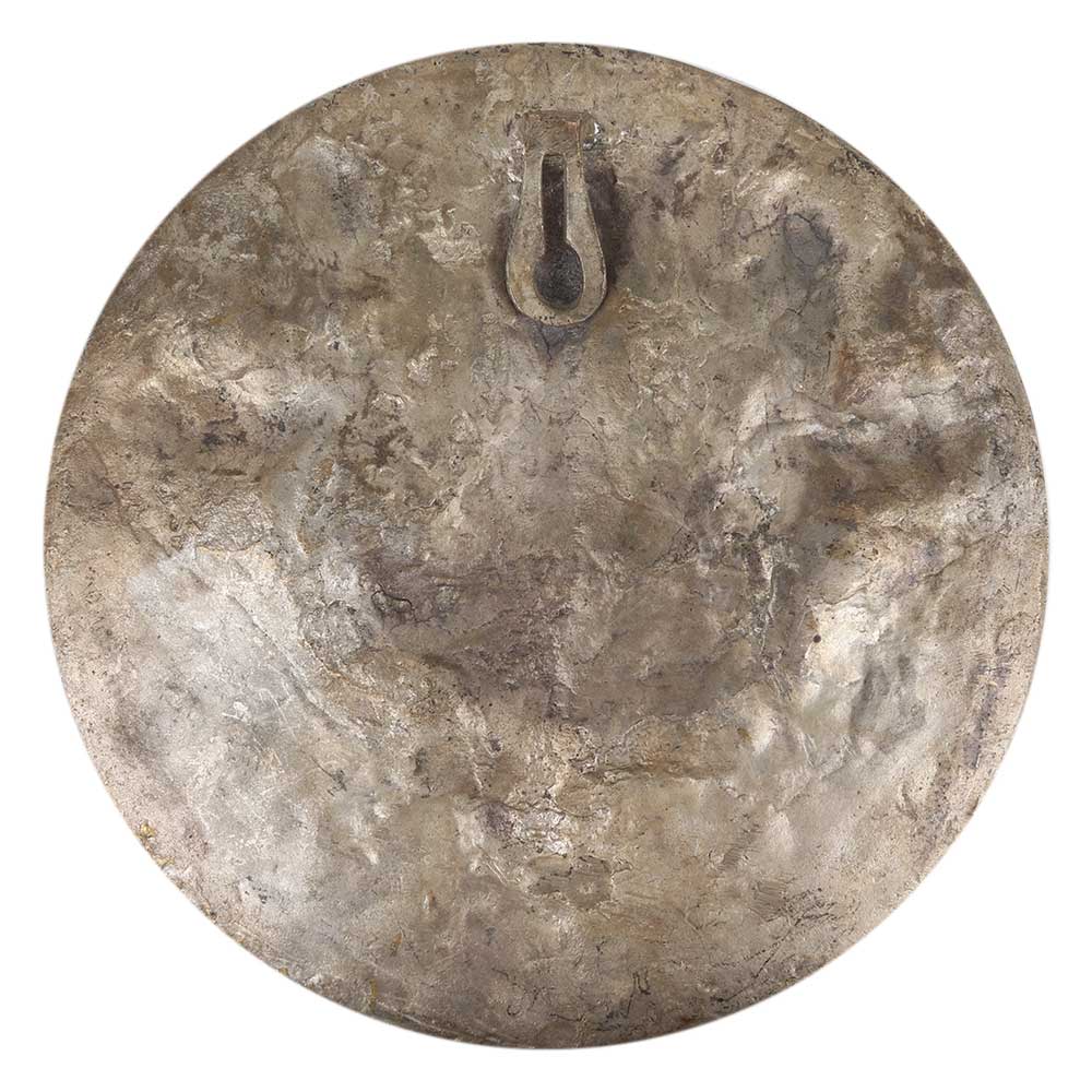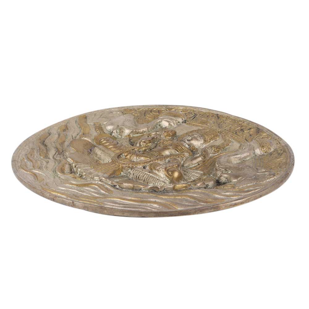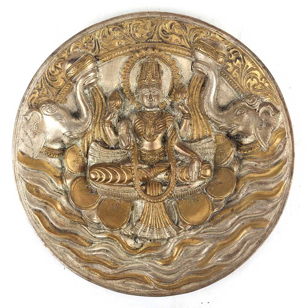 Handmade Brass Plate Embossed with Goddess Laxmi in the Center Sitting on a Lotus Flower with Two Elephants in the Background. This Image is Also Known as Gajalaxmi. This Brass Plate Serves as a Great Decorative Item a Gift or a Wall Hanging. Wedding gift, Diwali gift and house warming gift.