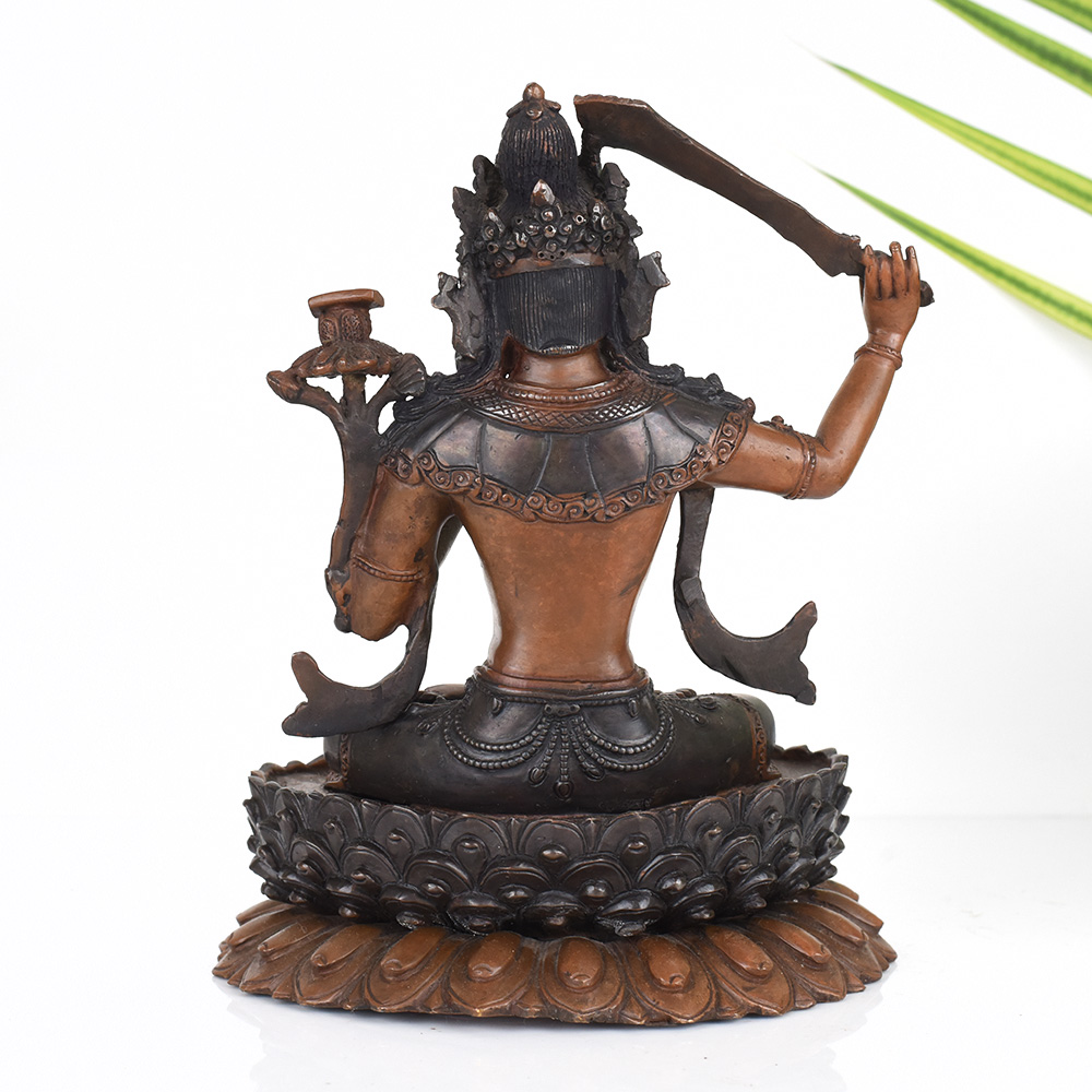 For centuries, Tibetan Buddhists have revered Manjushri as the embodiment of the enlightened mind - a celestial being who bestows the gift of profound insight and discernment. This vintage copper statue captures his essence with incredible detail, from the intricate Tibetan designs to the serene, focused expression on his face. Invite the blessings of Manjushri into your life by placing this stunning statue in your personal prayer room or meditation space. As you gaze upon his tranquil form, you'll feel a sense of inner calm wash over you, helping to quiet the chatter of the mind and open you to deeper spiritual understanding. Allow his celestial energy to inspire your practice, whether through seated contemplation, mantra recitation or study of the sacred texts. With Manjushri as your guide, you'll cultivate the wisdom and discernment to navigate life's challenges with clarity and insight. Let this magnificent copper statue be a touchstone for your spiritual journey, elevating your practice and illuminating the path to enlightenment.