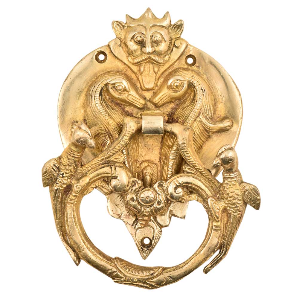 A very heavy door knocker in brass with a demon face on top with two intricately designed peacocoks on the knocker ring . Made by expert craftsmen of india using old traditional methods. The Brass door knocker has a brass ring that is banged on plate of the door knocker to produce the knocking sound. Lovely home decoration product and a wonderful gifting option for friends and relatives.