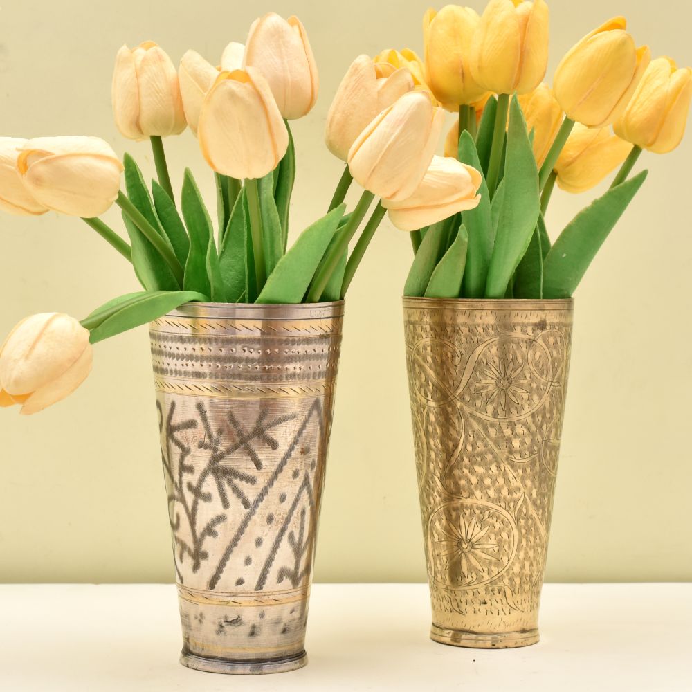 Golden Brass Embossed Floral Engraved Lassi Glass a sturdy, elegant, and lovely addition to your home decor. It is frequently quickly transformed into a lovely day of remembrance, Wedding, Diwali, or Valentine gift item.