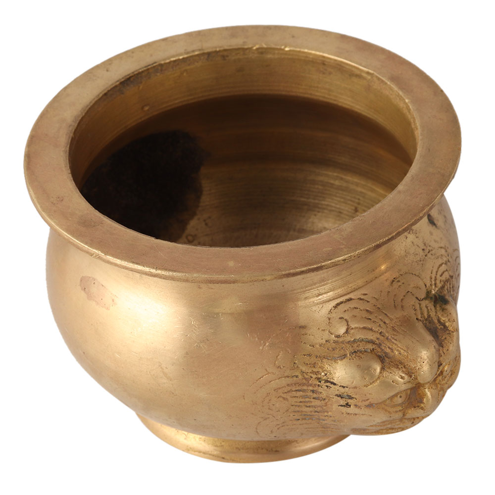 A gold-coloured brass Lota water pot is engraved with two embossed lion faces in Chinese art. The Lota is an important element in all Hindu rituals and temples, as it is used to hold sacred water, rice, precious stones or gold coins. Offer water to the sun in the morning by using the attractive Lota. It makes you disciplined and keeps your body and mind balanced. It is often used to keep Gangajal (sacred water from the river Ganga) in the house and temples. A charming gift for New Year, anniversary or birthday to your friends and relatives.