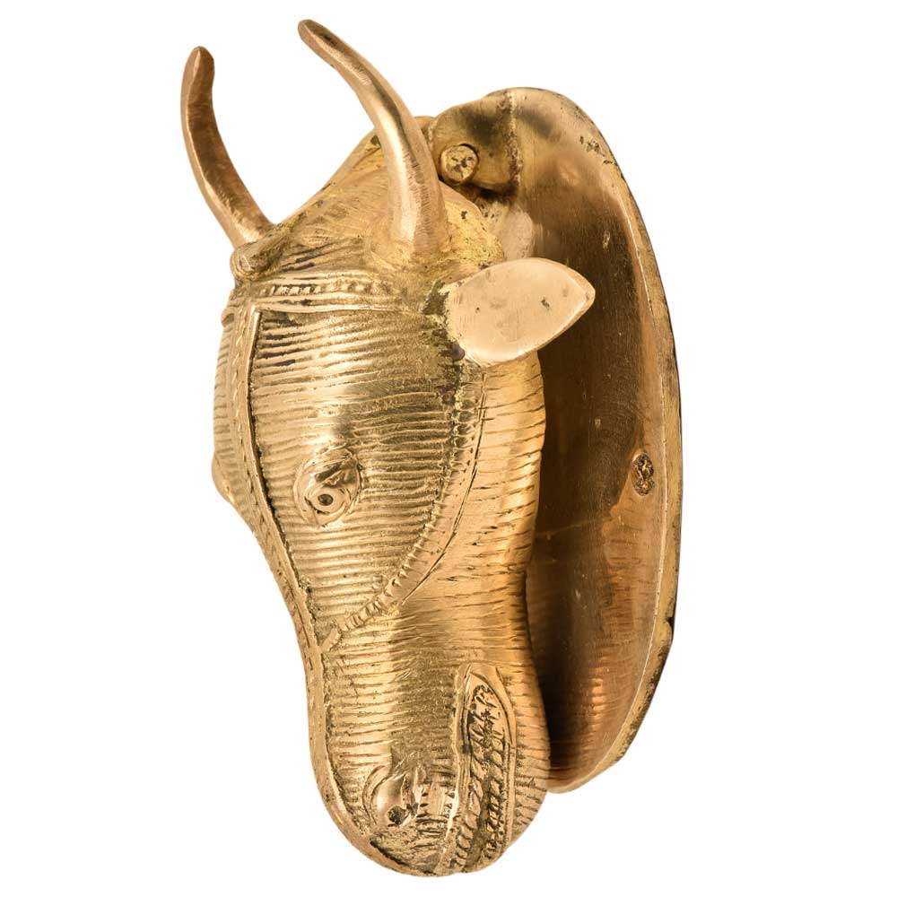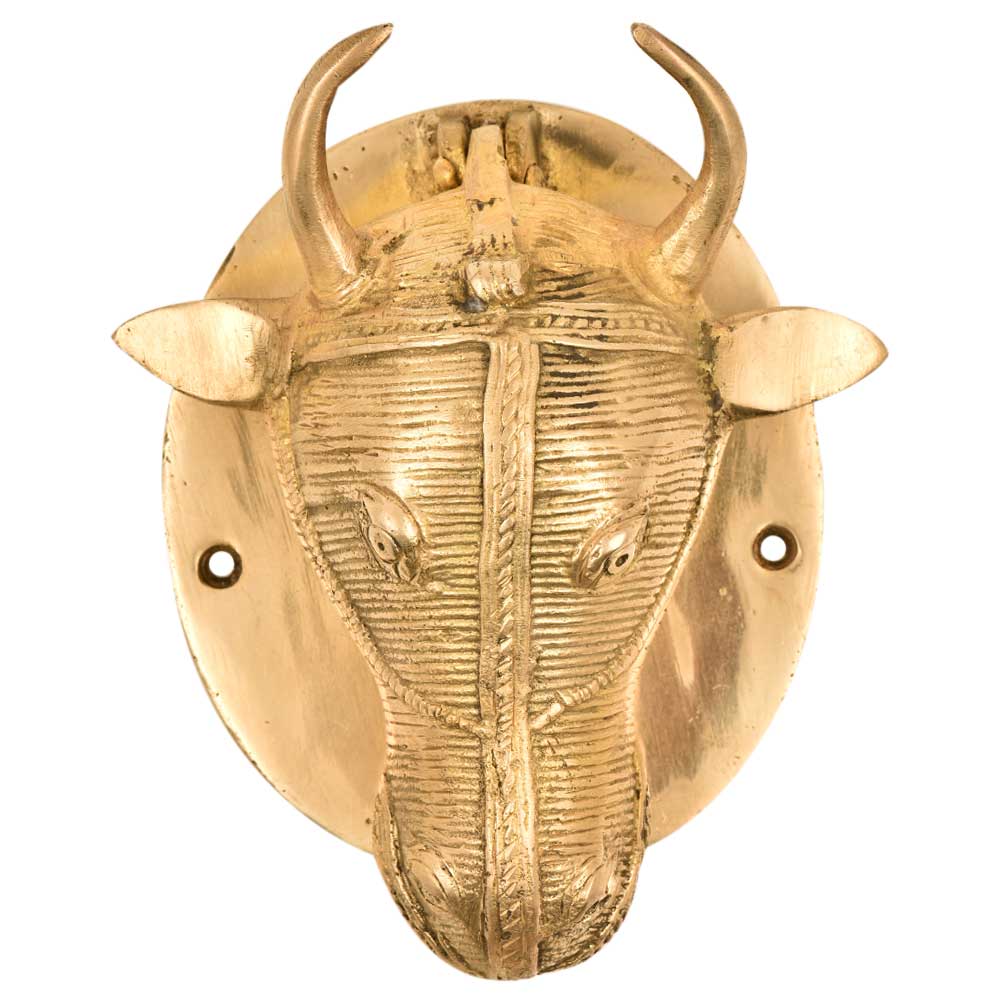 Handmade Brass Ox head, possibly Nandi or Bhuta mask, made by local or tribal artisans using old and traditional dhokra art. A beautiful and characterful door knocker created in solid high grade brass it really is the cutest door knocker and perfect for doors, where space is limited. Made of solid brass, this door knocker includes matching mounting hardware and striking plate.