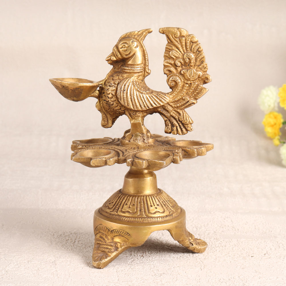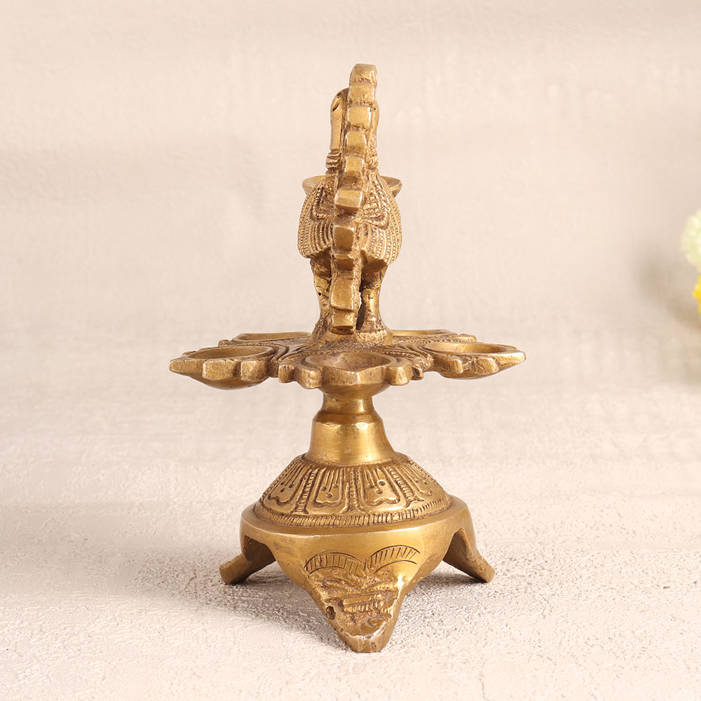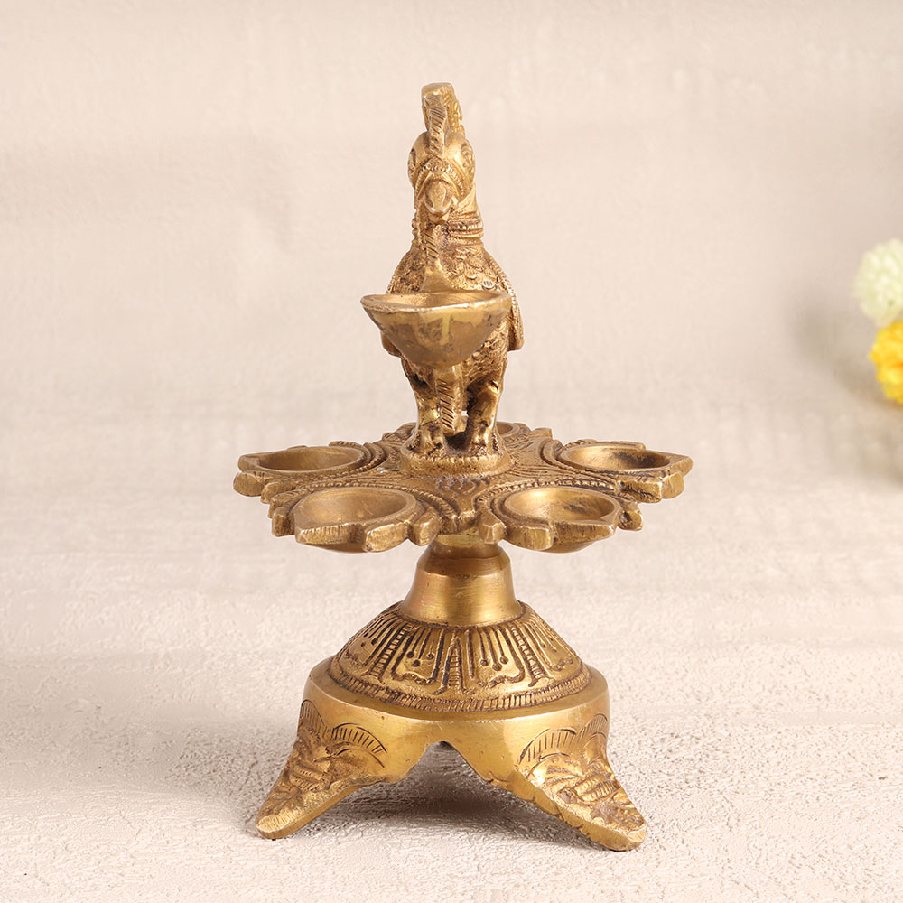Illuminate your space with the timeless elegance of this exquisite brass oil lamp. Crafted by highly skilled Indian artisans, this lamp is a true work of art. It stands gracefully on three intricately carved legs, each adorned with a majestic peacock figure, symbolizing grace and beauty. The lamp's antique golden finish adds a touch of vintage charm to any setting. It features six jyots, allowing you to create a radiant and warm atmosphere using either mustard oil or ghee with cotton wicks. Whether you place it in your home, office, hotel, cafe, shop, restaurant, or prayer room, this lamp is a versatile piece that effortlessly blends with various decor styles. This lamp is not just a source of illumination but also a decorative masterpiece. It makes for a wonderful addition to your vintage collection and an eye-catching exhibit at exhibitions. Use it during prayers, auspicious occasions, or simply to infuse your space with a sense of tranquillity. Moreover, this exquisite lamp makes for an exceptional gift for your family, friends or relatives on special, festive, or auspicious occasions, conveying your warmth and blessings through its radiant glow. Embrace tradition and artistry with this brass oil lamp, a symbol of timeless beauty and culture.
