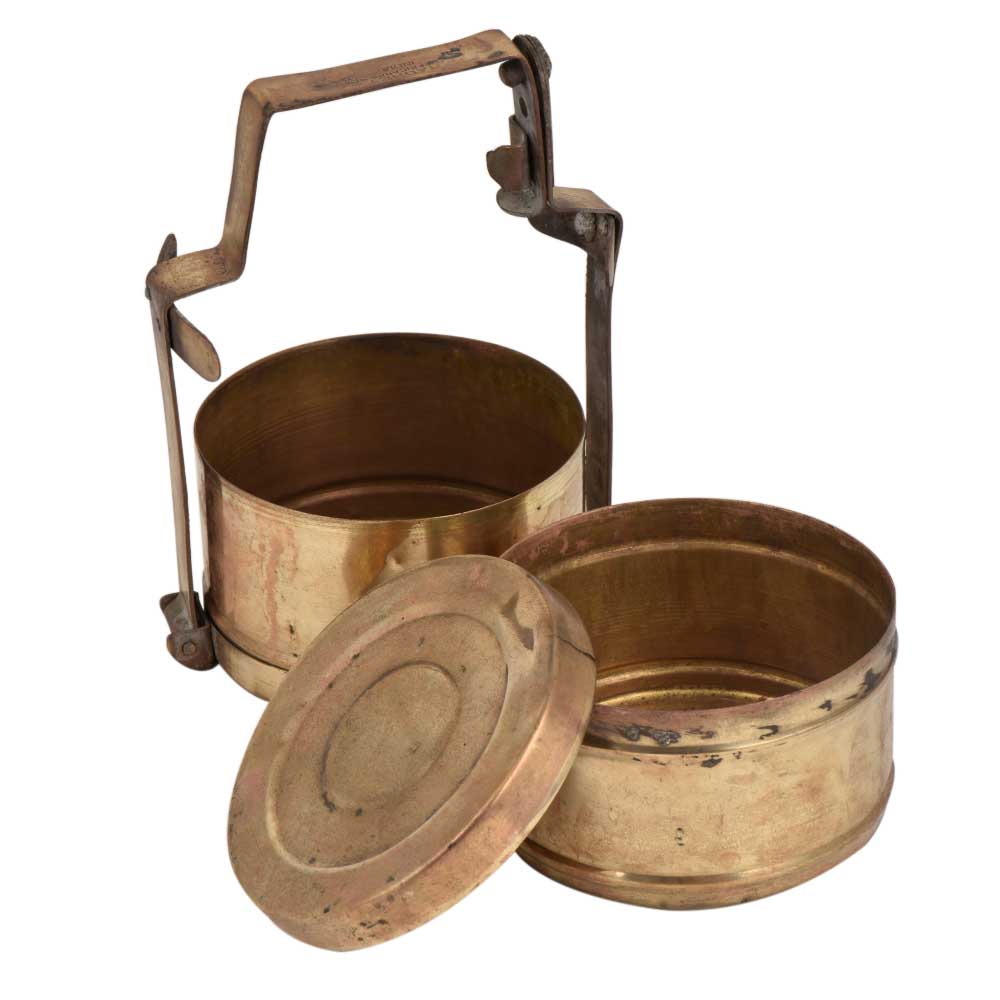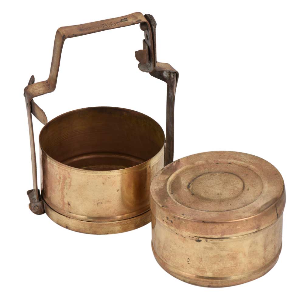 Golden Brass Tiffin Box wit two compartments that is placed one above the other and held together with the help of a wide brass frame that has an inbuilt locking system. Use it as table display, presentation of food by bloggers, fill in candies and gift it to your near and dear ones or as a jewelry storage box.