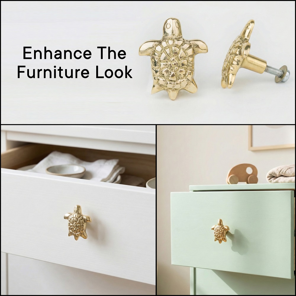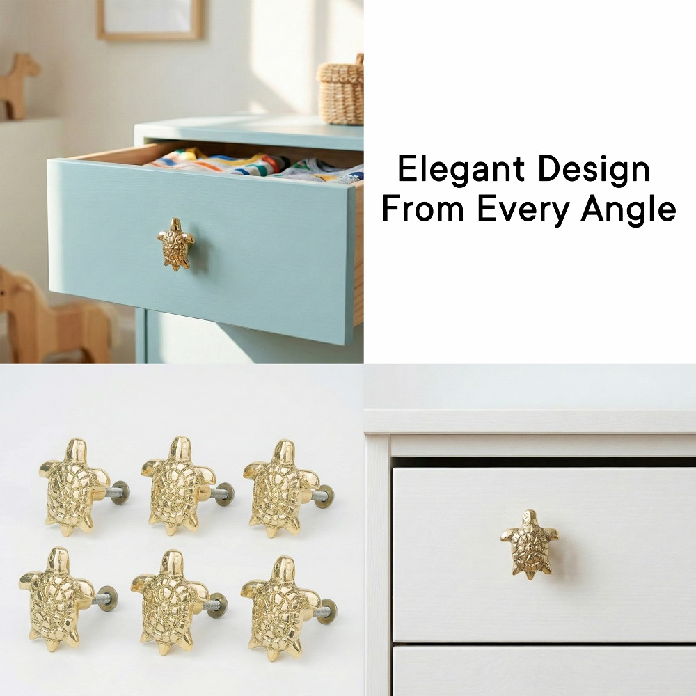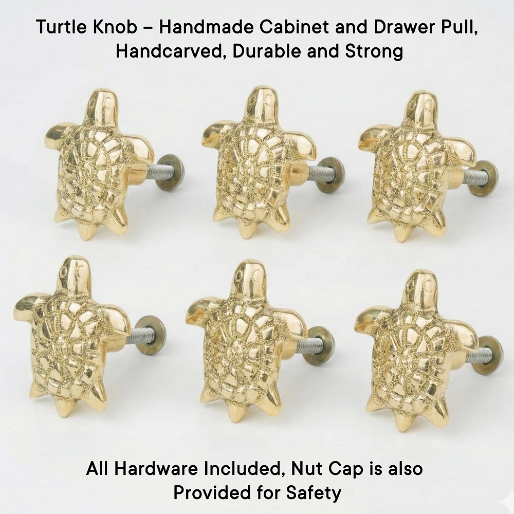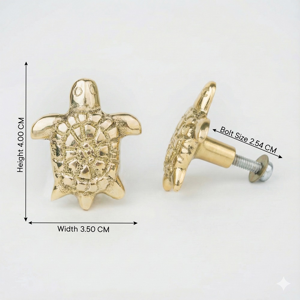Bring a touch of luxury and symbolism to your interiors with this handcrafted golden brass turtle knob. Expertly cast from solid brass, this elegant knob showcases intricate detailing inspired by the turtles shell, symbolizing longevity, strength, and good fortune. Its polished golden finish adds a refined, timeless appeal to any cabinet, drawer, or furniture piece. Perfect for enhancing modern as well as traditional dcor themes.