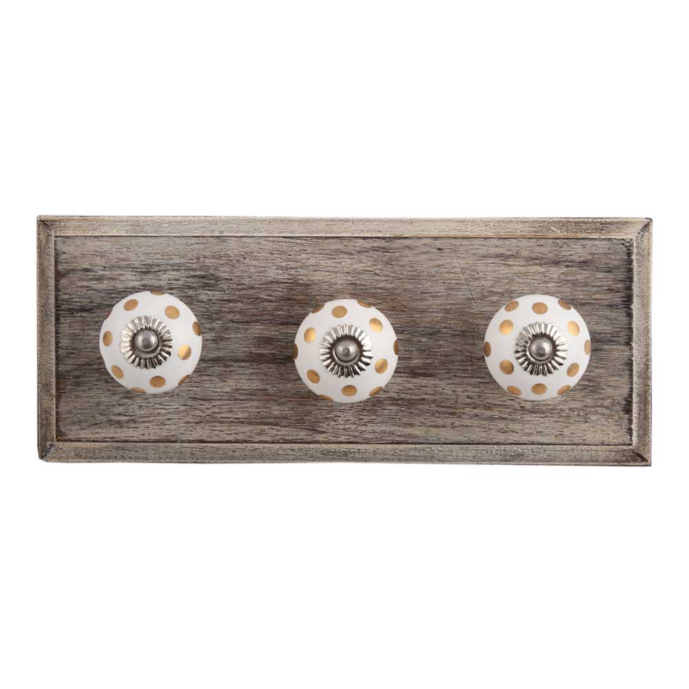 Golden Dot Ceramic Wooden Hook. A Perfect Complement to the Soft Tone of the Wood are these White Traditional Hat & Coat Hook Made of Genuine Porcelain and Brass. It can be use to Hang Jewellery, Leashes, Towels, Scarves, Light Weight Sweaters, Caps Etc.