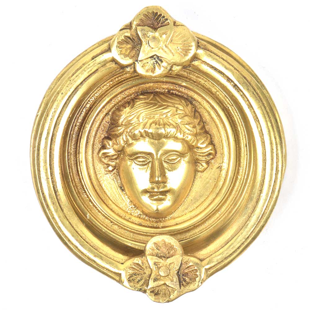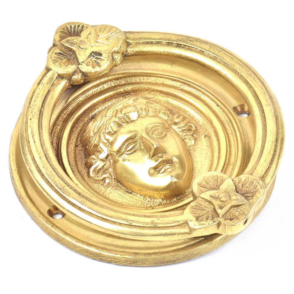A very unique roman style door knocker where the Roman face is placed in the centre and is bascically the base plate and the knocker is in the form of ring with two flowers one at the top and the other at the bottom. Put it on your main door and give a vintage look to old door.