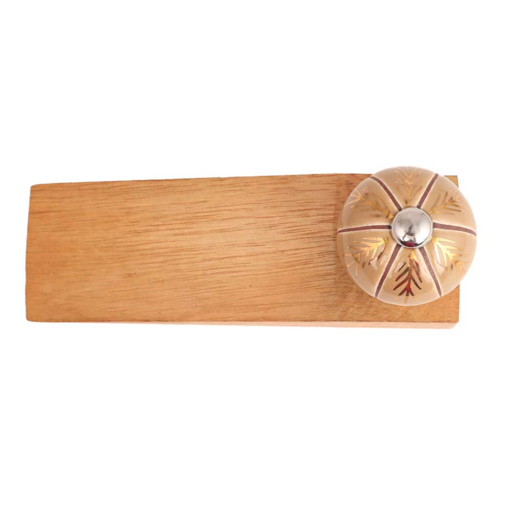 Golden Leaf Ceramic Floral Wooden Door Stopper.Wooden Door Stopper with a Ceramic Knob to Carry it Easily. This Wooden Door Stopper has Glue Dots under it to Ensure that it does not Slip. It is Handmade by the Craftsmen of India and this Innovative Door Stopper won't Disappoint You.