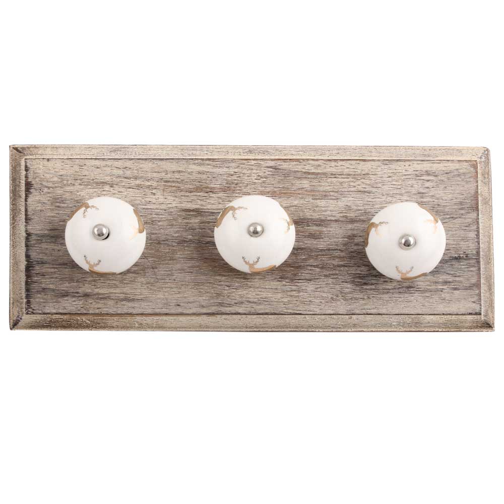 Golden Standing Rein Deer Pattern Ceramic Wooden Hook. A Perfect Complement to the Soft Tone of the Wood are these White Traditional Hat & Coat Hook Made of Genuine Porcelain and Brass. It can be use to Hang Jewellery, Leashes, Towels, Scarves, Light Weight Sweaters, Caps Etc.