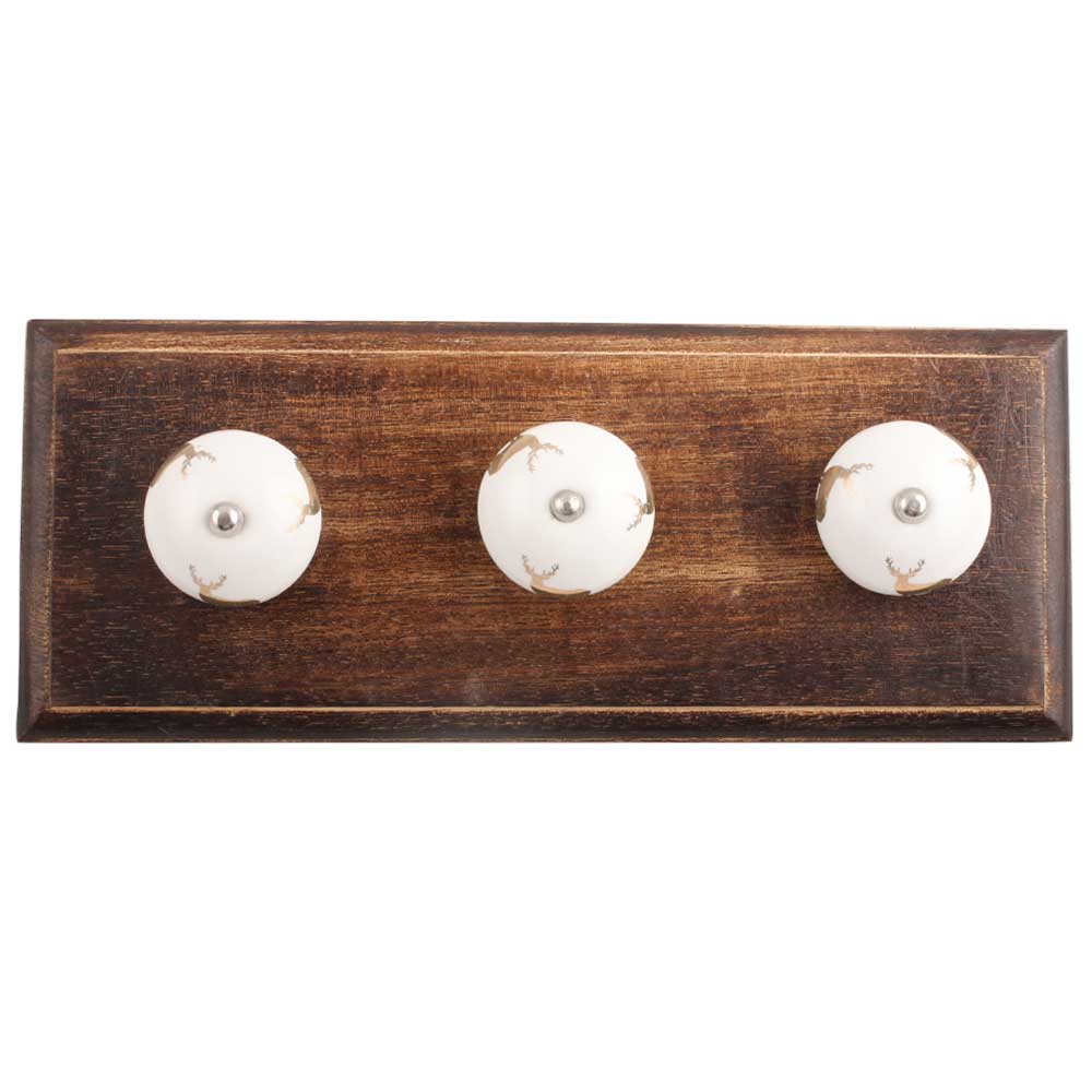 Golden Standing Rein Deer Pattern Ceramic Wooden Hook. A Perfect Complement to the Soft Tone of the Wood are these White Traditional Hat & Coat Hook Made of Genuine Porcelain and Brass. It can be use to Hang Jewellery, Leashes, Towels, Scarves, Light Weight Sweaters, Caps Etc.